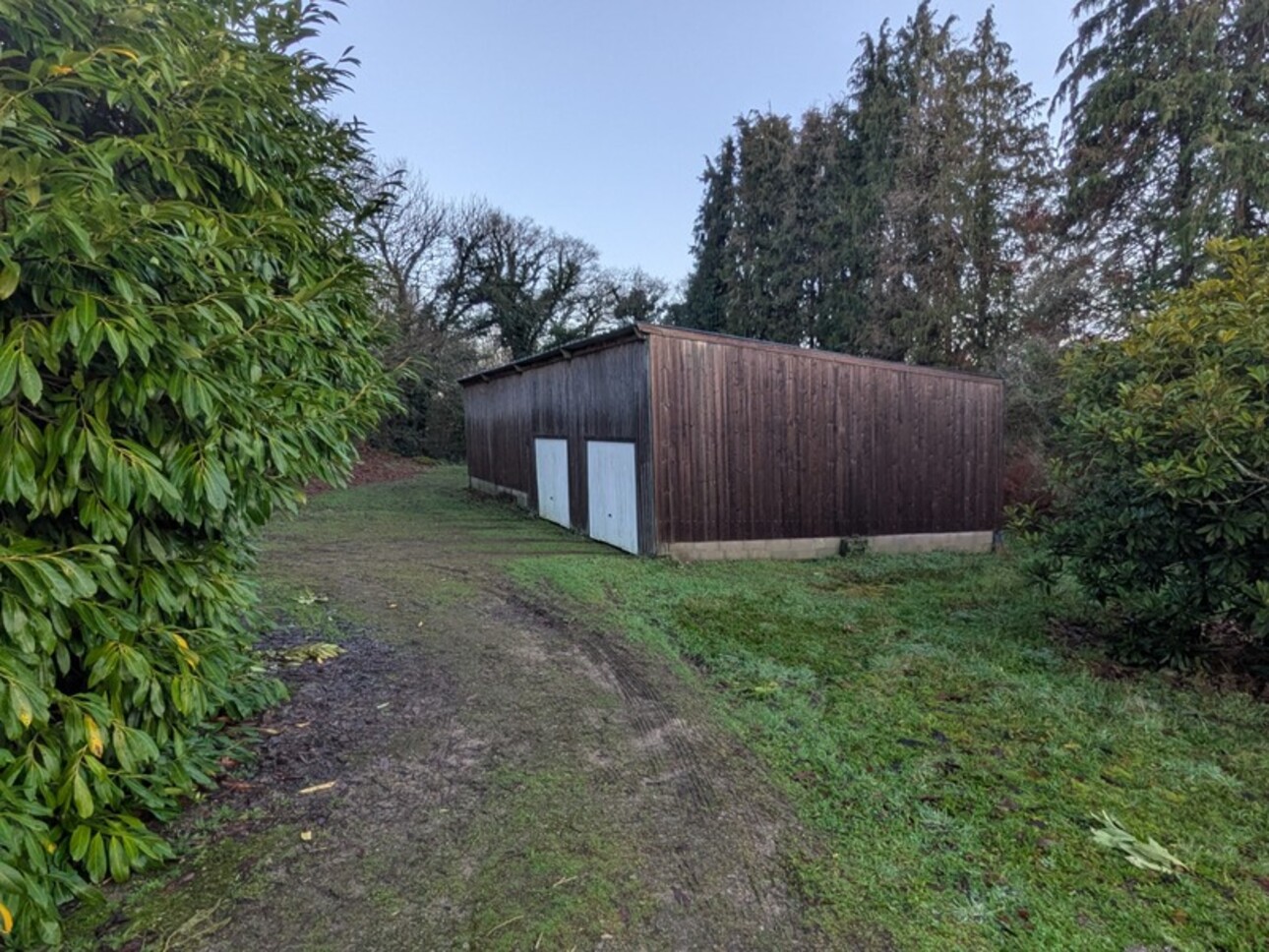 Un hangar fermé avec deux garages pour voiture et équipement agricole.