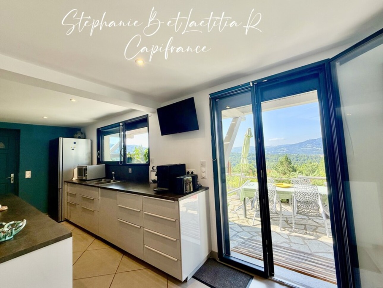 • A large living space with open kitchen, dining room and living room with its home cinema opening onto a large terrace with a view.