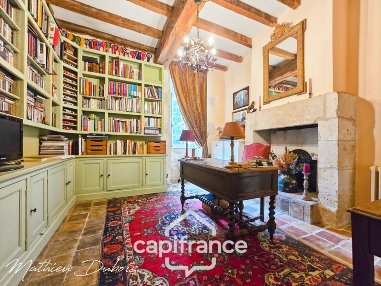- Carreaux de Gironde patinés, cheminées monumentales, poutres apparentes, bibliothèques sur mesure et volumes généreux donnent le ton dès l'entrée.