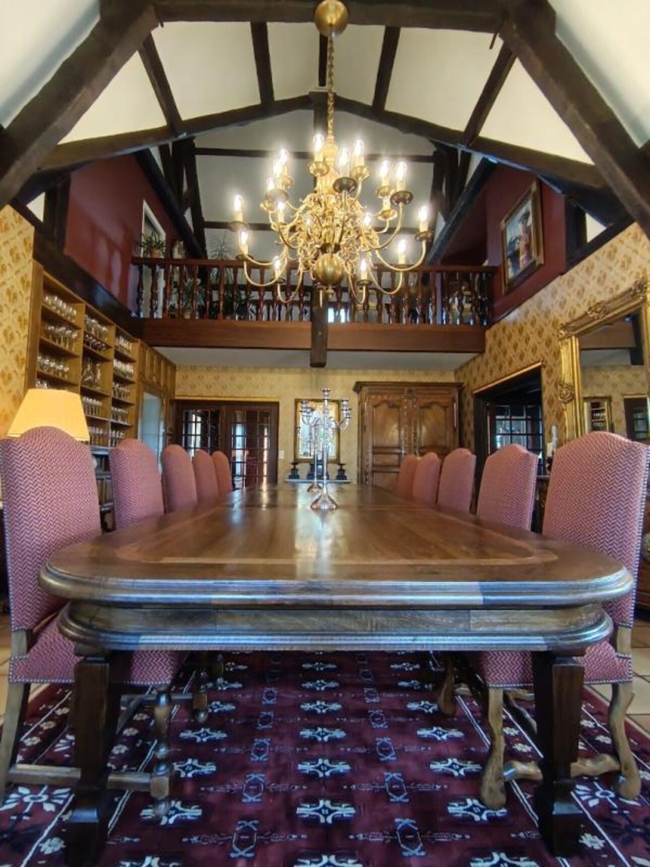 La salle à manger cathédrale , baignée de lumière , s'ouvre sur une mezzanine élégante , créant une sensation d'espace et de hauteur particulièrement appréciable .
