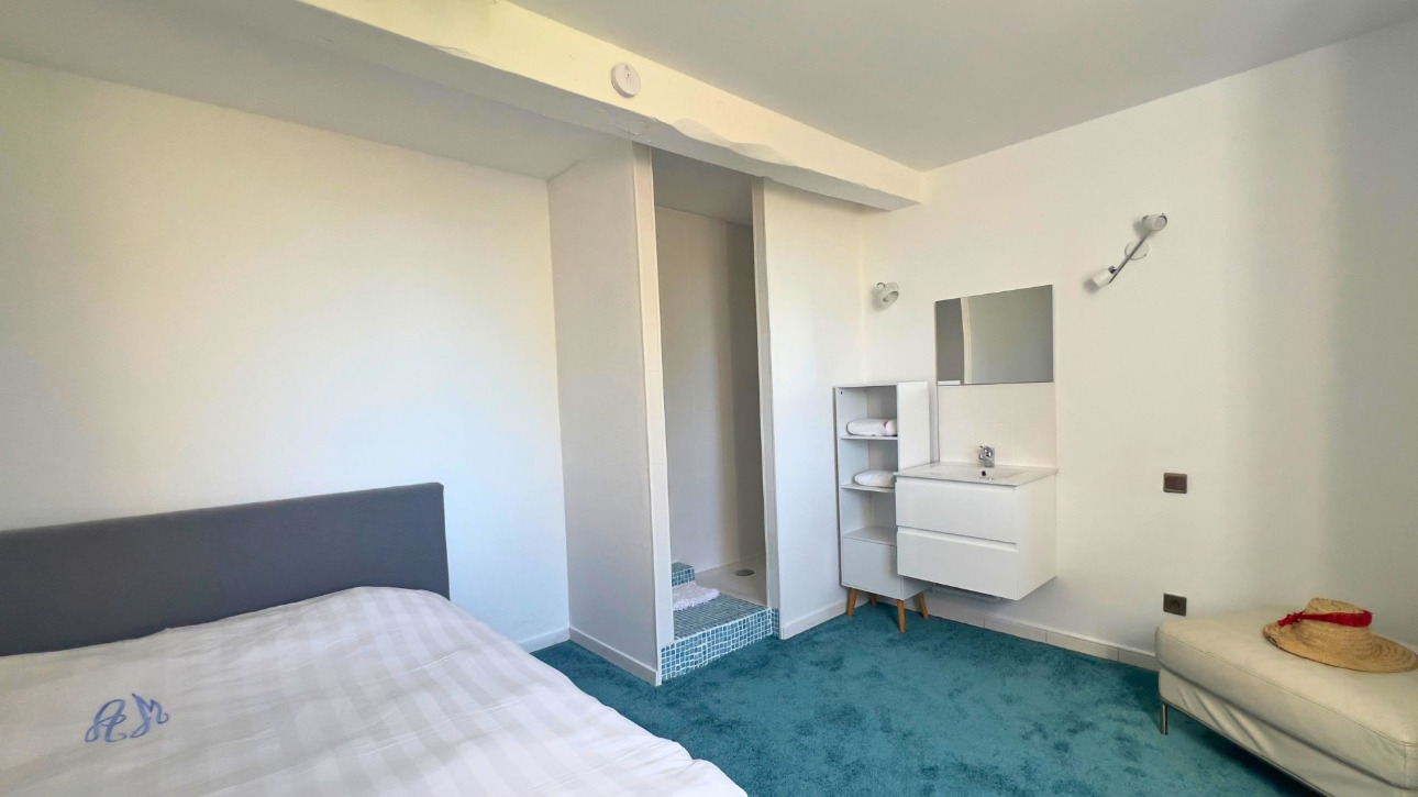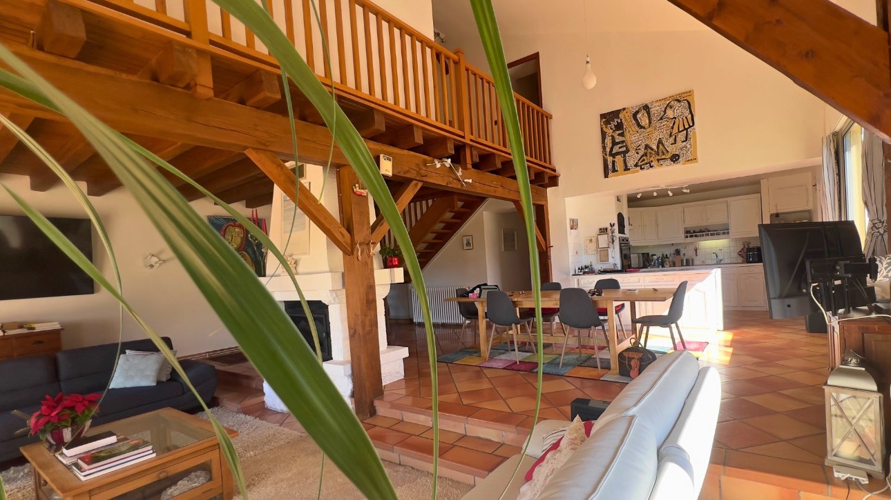 Au rez-de-chaussée, le bien sorganise autour dun hall dentrée desservant une première cuisine, idéale pour des moments conviviaux, prolongée par une seconde cuisine plus intimiste ouverte sur une vaste pièce de vie lumineuse. Cet espace chaleureux, agrémenté dun double insert, offre une atmosphère à la fois accueillante et apaisante. Deux chambres avec leurs salles deau privatives complètent ce niveau.
