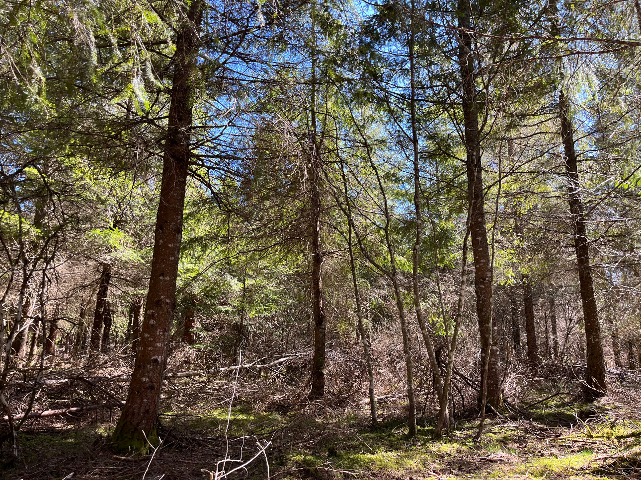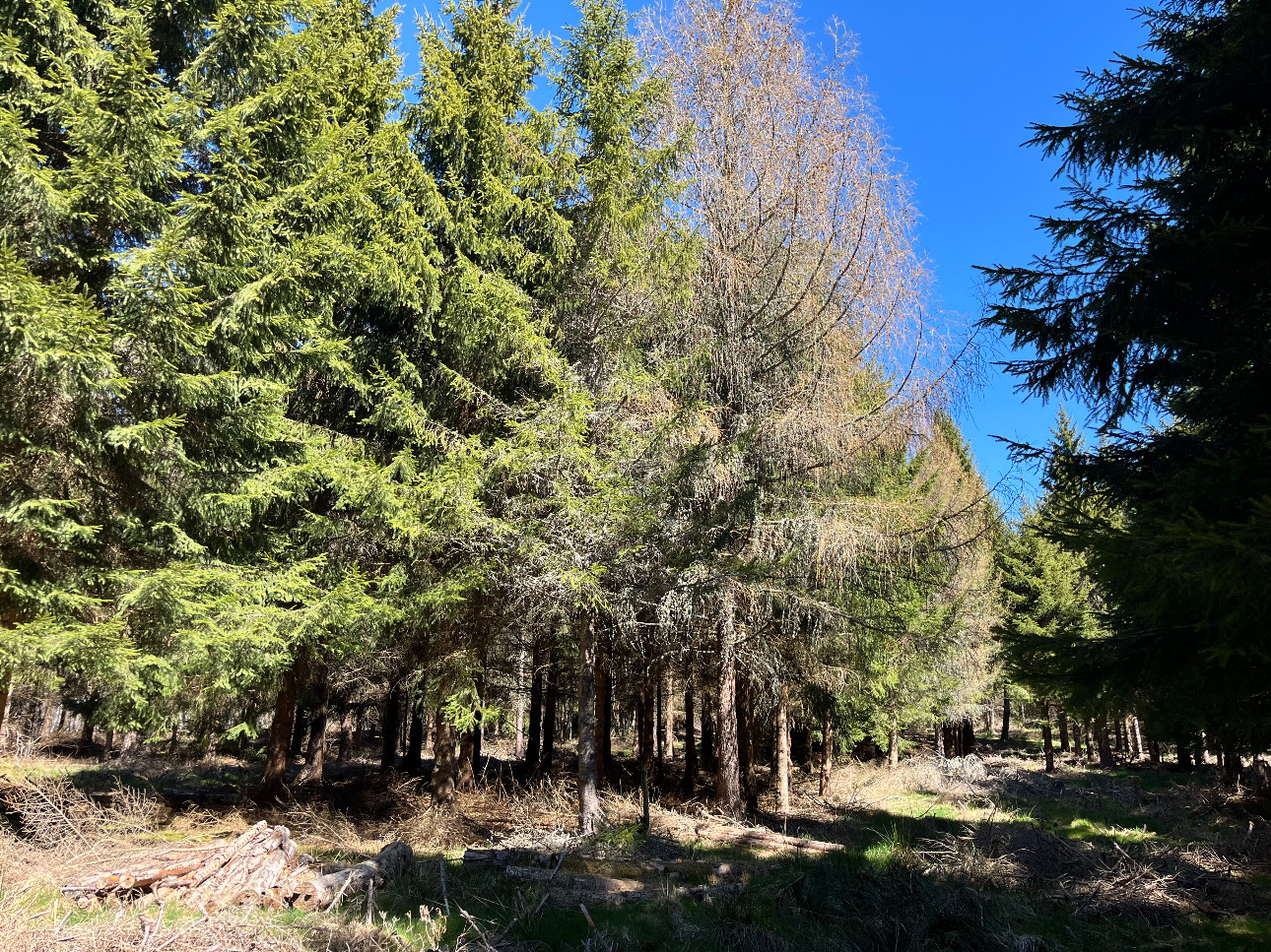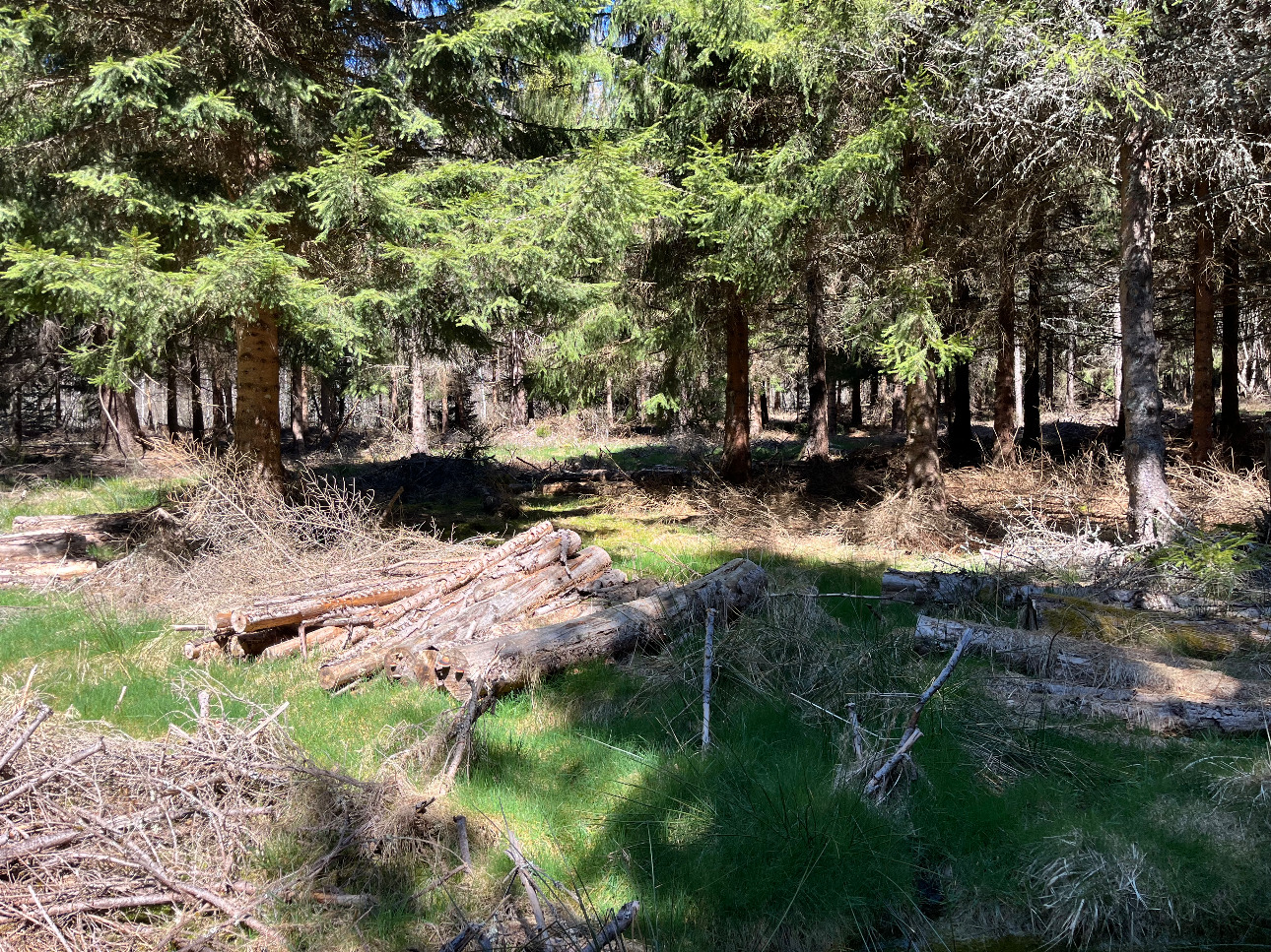 Le peuplement est issu d’une plantation d’environ 35 ans sur anciennes terres agricoles. Il s’agit d’une futaie régulière résineuse, dominée par l’épicéa en zone humide et le Douglas sur les parties plus portantes, avec quelques mélèzes.