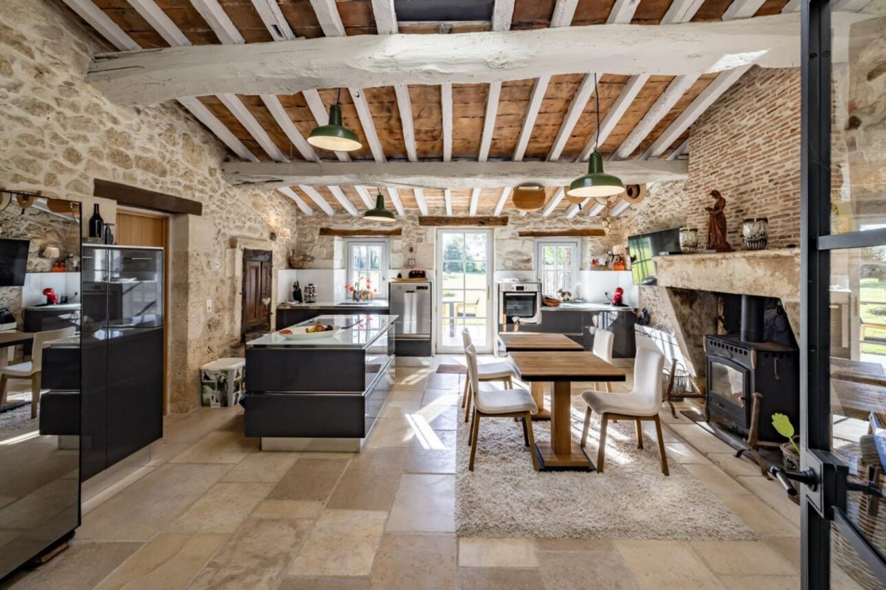 Le corps principal, empreint de charme et d'authenticité, offre de vastes espaces de réception : une élégante salle à manger, un salon lumineux et une grande cuisine familiale. Une maison d'amis attenante dispose de son propre séjour, d'une salle à manger et de deux chambres confortables.