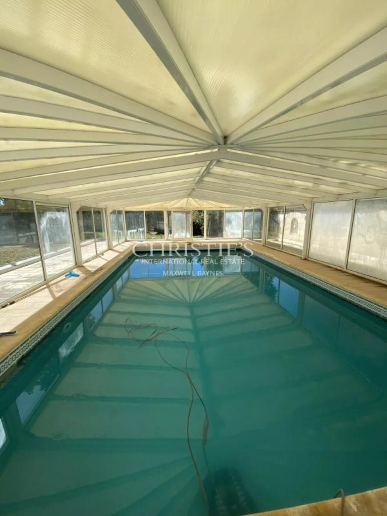 Piscine intérieure (12 x 6 m) dans une structure vitrée avec bâtiment dédié.