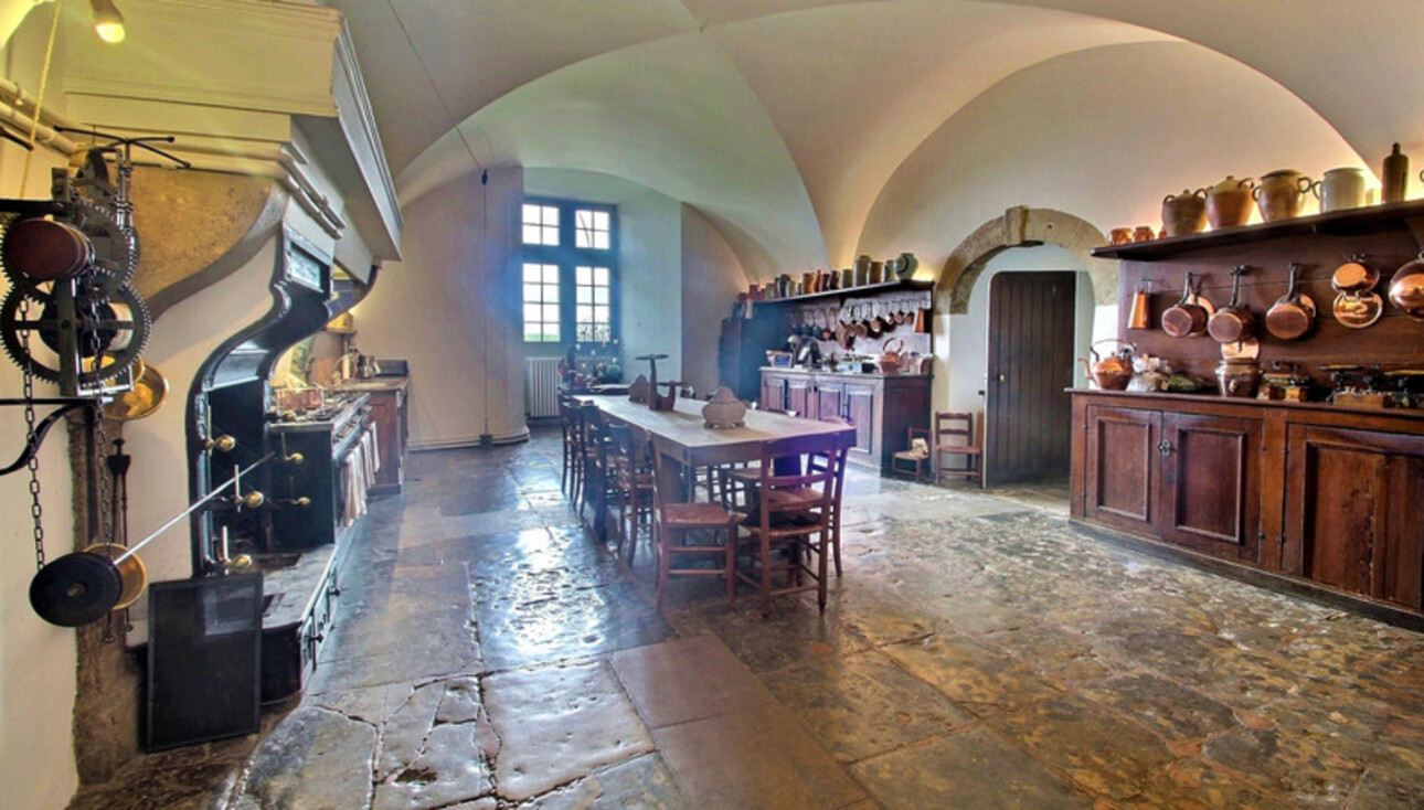 Le premier niveau en contrebas, dont les pièces sont voutées propose, une grande cuisine dînatoire du XVe siècle avec cheminée, une cuisine semi-professionnelle, une arrière cuisine, une salle de chasse avec cheminée, une salle à manger avec accès à un cellier du XIIIe siècle taillé à même la roche.
