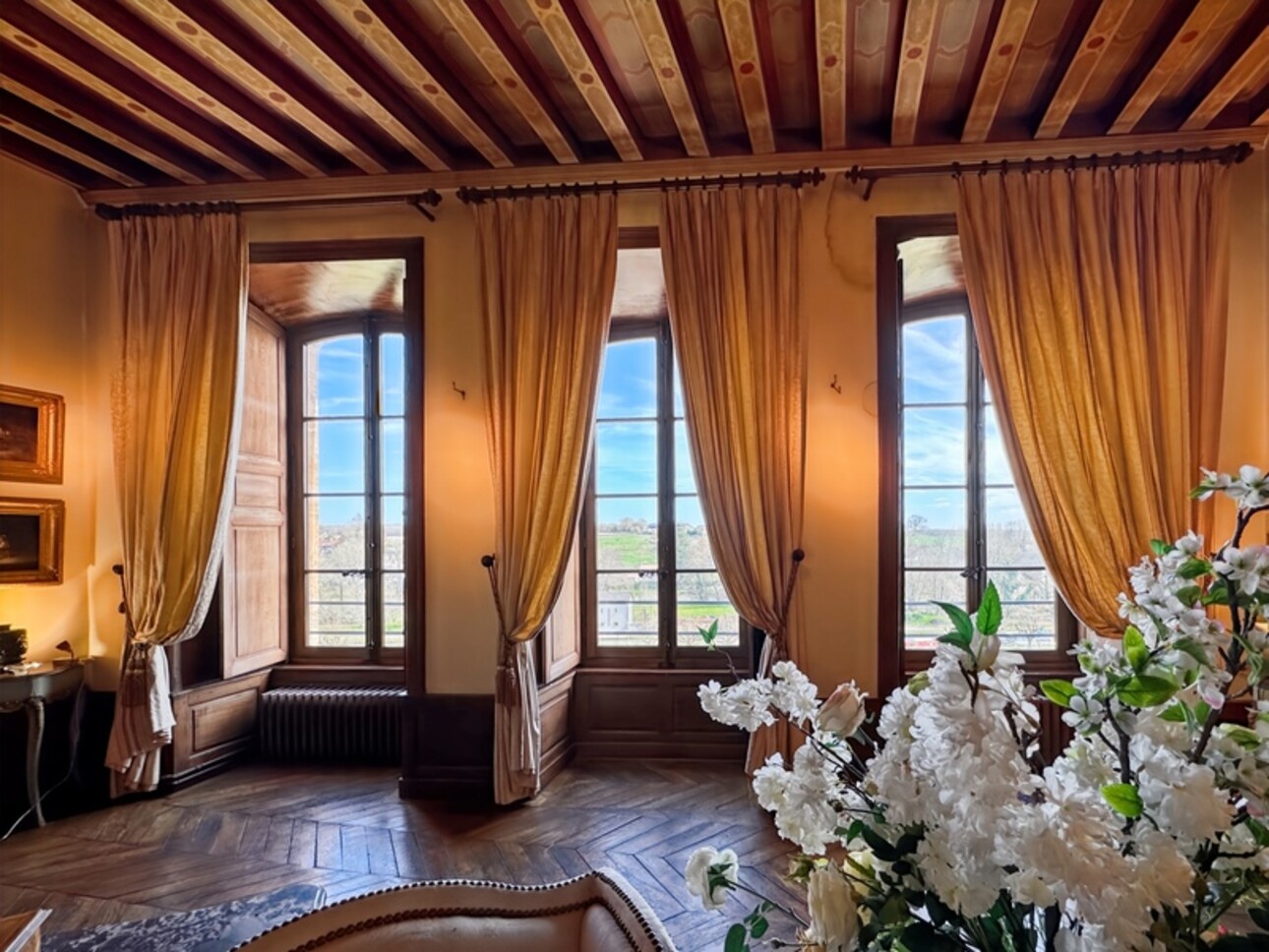 Le second niveau avec sa galerie d'entrée, le grand salon avec cheminée, le salon bibliothèque avec cheminée, le salon de musique avec cheminée, trois chambres chacune équipée de salle de bain.