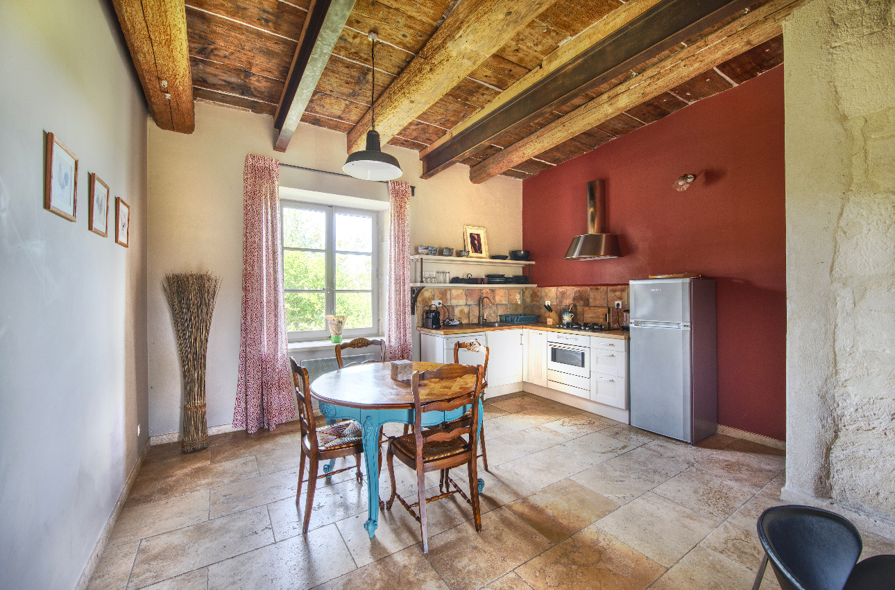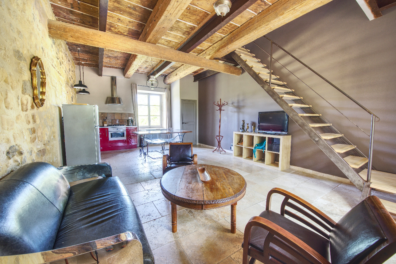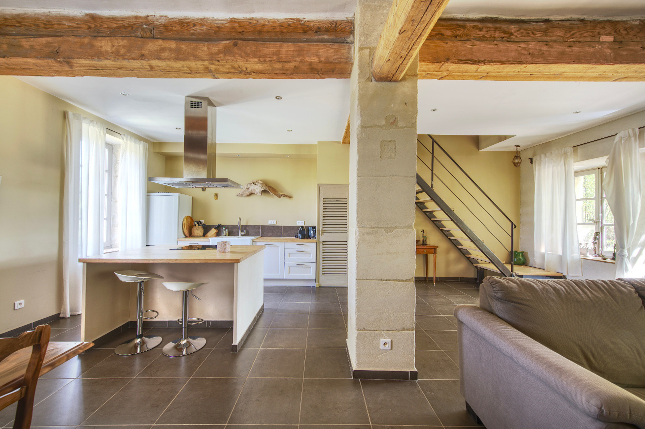 Le corps du mas abrite 4 logements indépendants, sur 300 m2 environ, entièrement rénovés dans le respect de l'âme provençale : tomettes anciennes, pierres apparentes et poutres en bois côtoient des aménagements contemporains offrant tout le confort moderne. Chaque espace invite à la sérénité, entre ombre fraîche des murs épais et lumière dorée filtrant par les grandes fenêtres traversantes