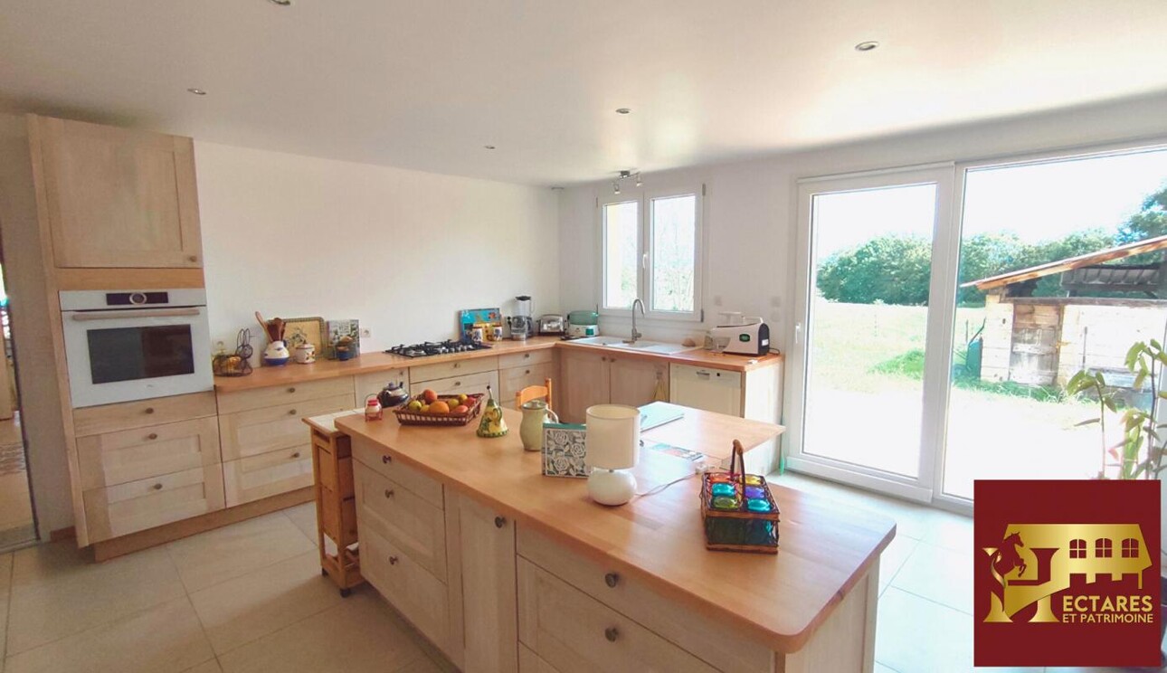 L'habitation principale, très lumineuse, propose en rez-de-chaussée une belle pièce de vie pleine de lumière grâce à ces portes fenêtres, une cuisine équipée avec ilot, une buanderie, une chaufferie.