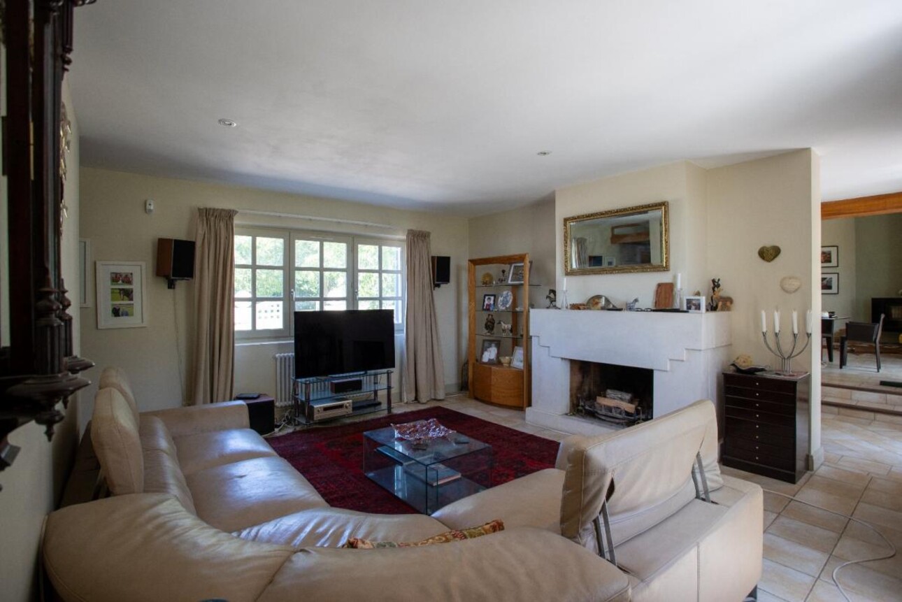 Le salon, pièce centrale du rez-de-chaussée, est cozy. avec une belle cheminée et une luminosité traversante.