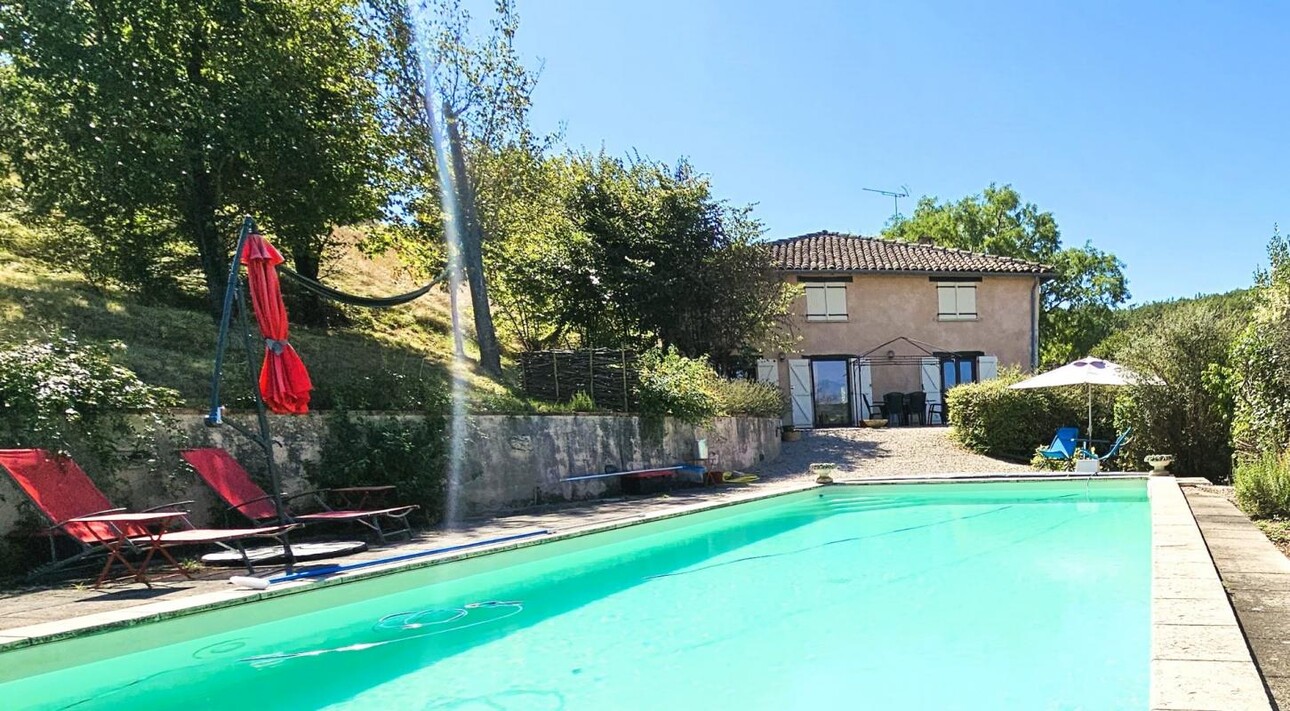 A la sortie du village bastide de Castelnau-de-Montmiral, proche de Gaillac, par un chemin privé on accède à cette propriété, ancienne borderie de 259 m² habitables.