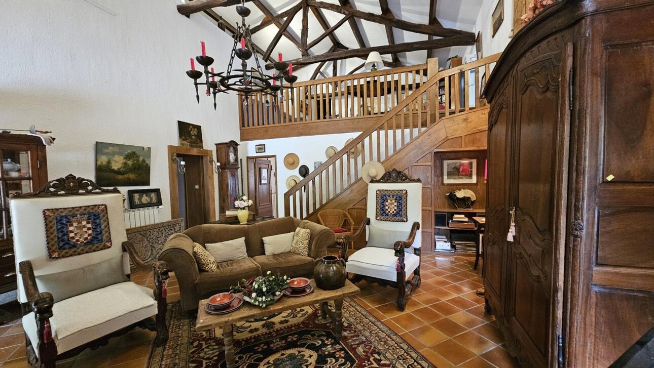 Sous le vaste porche, l'entrée du rez-de-chaussée dessert un salon de presque 40 m² au plafond cathédrale où une magnifique cheminée monumentale avec insert apporte majesté et confort.