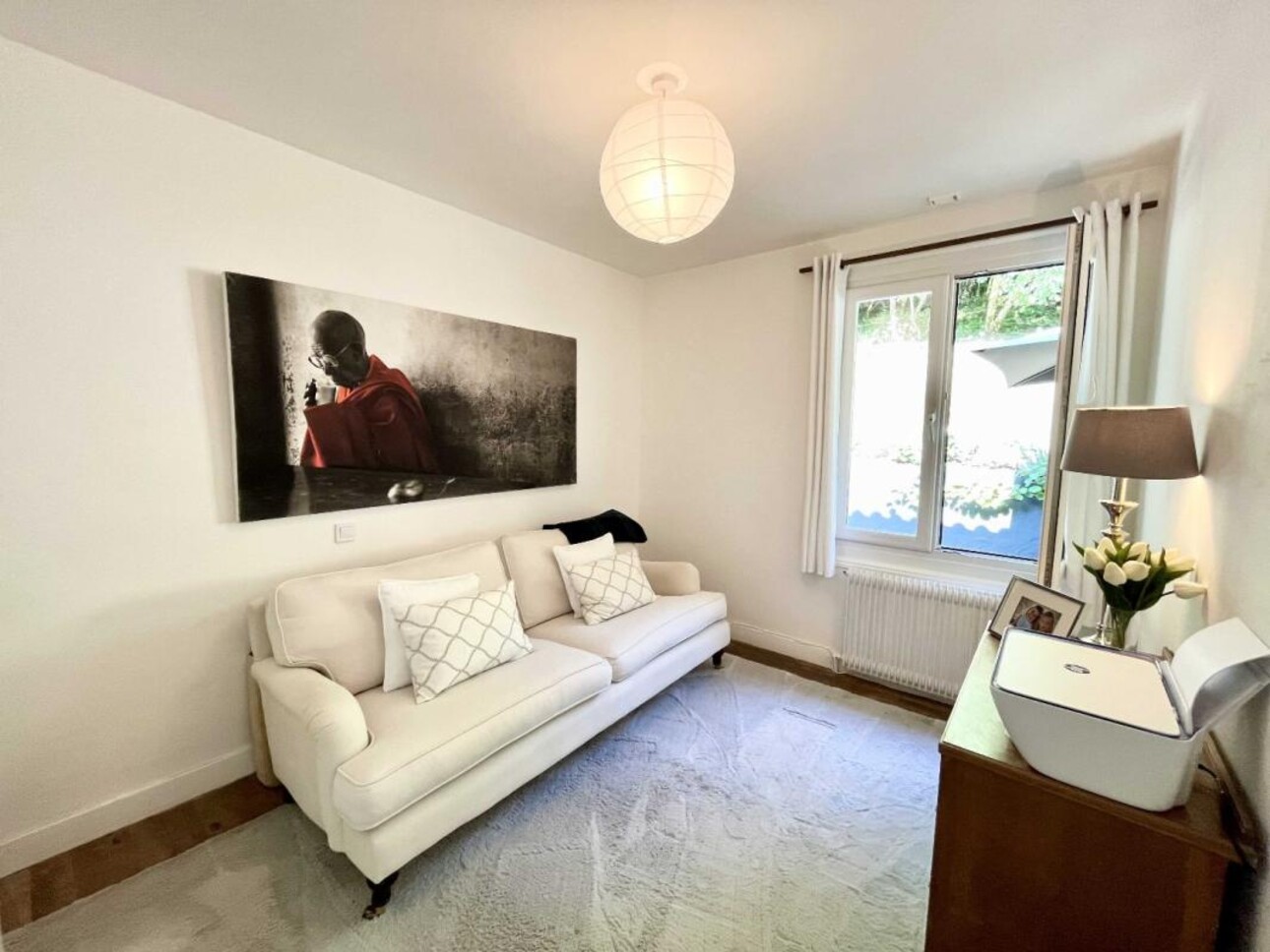 La spacieuse et lumineuse pièce principale avec insert s'ouvre sur la terrasse arrière et mène à deux chambres double et à une salle de bain avec douche à l'italienne et baignoire.