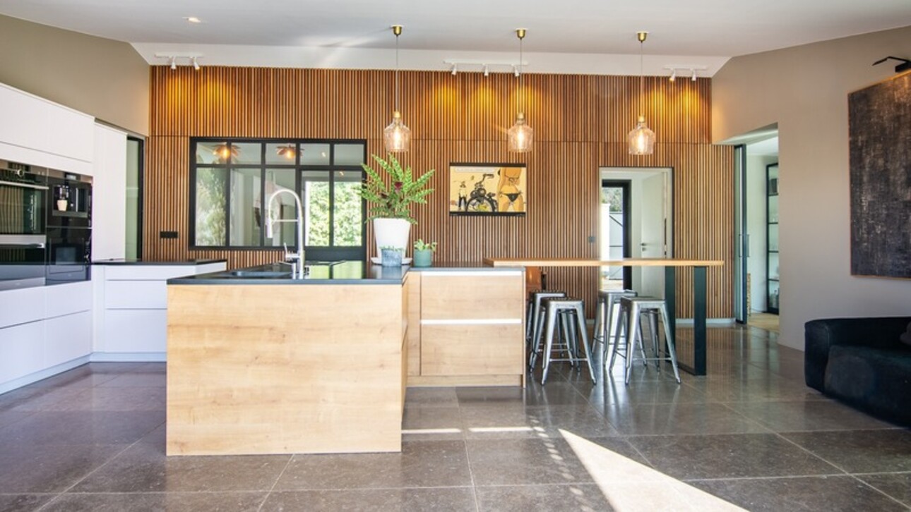 Ce qui frappe d'abord ici, c'est l'échelle. Un séjour et une cuisine qui totalisent près de 100 m², deux espaces distincts qui se répondent, ouverts sur la terrasse plein sud par des baies à galandage, sous une hauteur sous plafond de 5,10 m (espace salon). La frontière entre intérieur et extérieur s'efface naturellement.