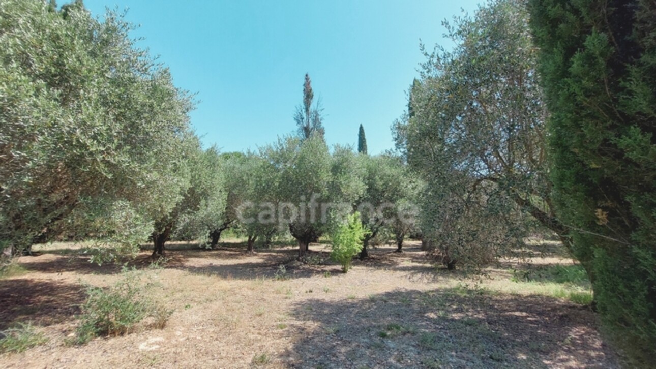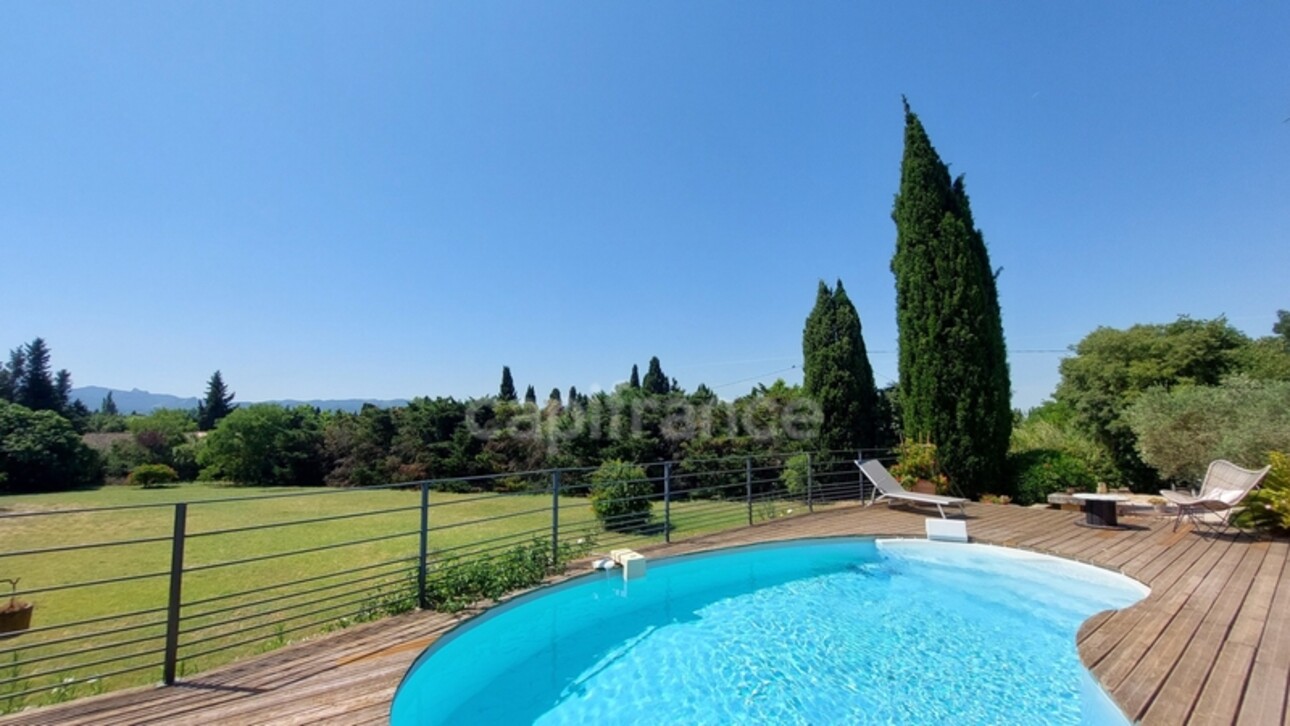 Sur la terrasse, la piscine profite d'une exposition plein sud et d'une vue imprenable sur les Alpilles. Le jardin paysager, planté d'une oliveraie, apporte une ambiance typiquement provençale.