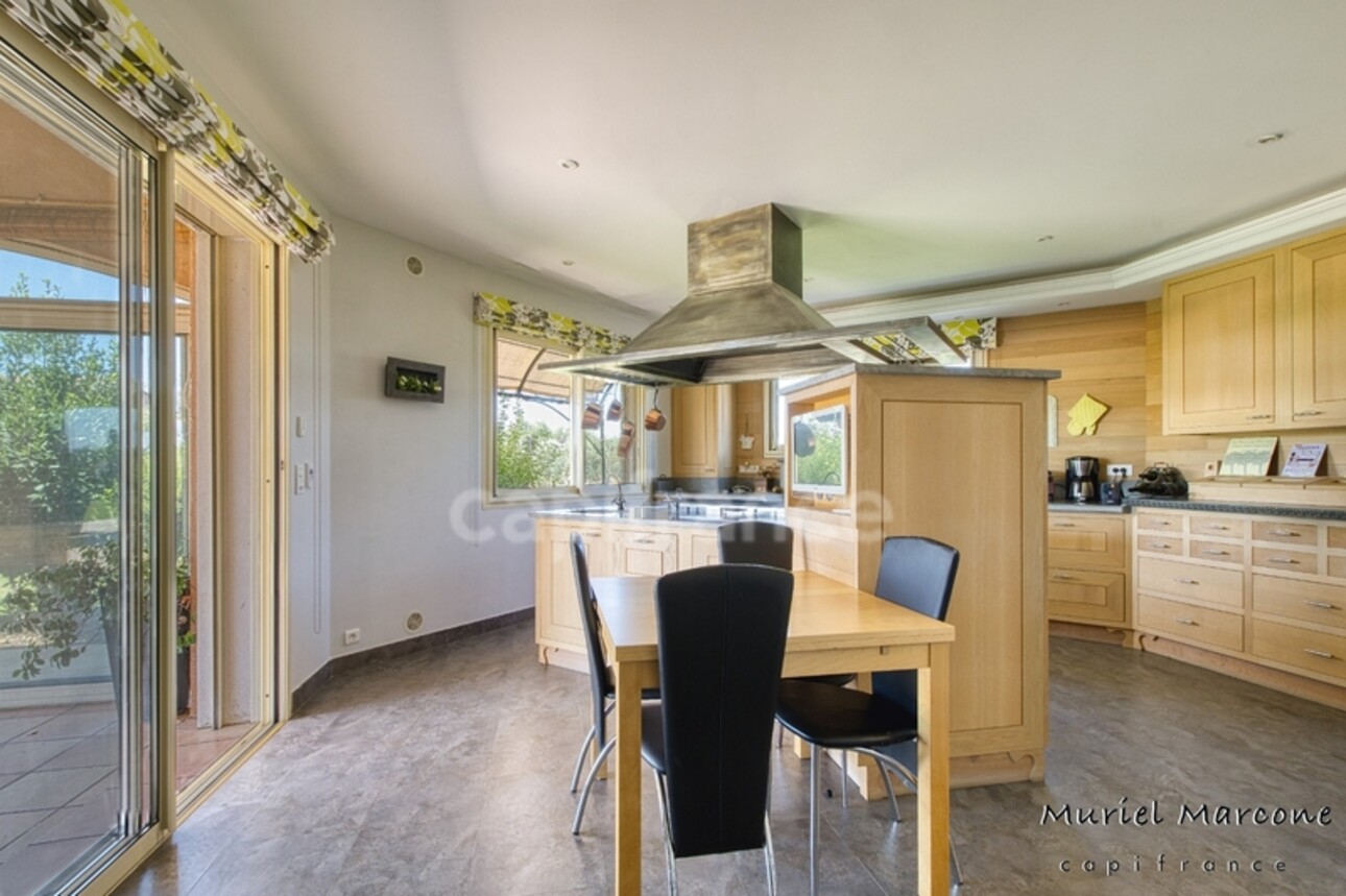 Dès l'entrée, un vaste hall de 24 m² donne le ton et conduit à un salon avec cheminée. Celui-ci s'ouvre sur une véranda au caractère unique, dotée d'un plafond vitré et d'une large baie tournée vers le jardin, qui accueille un espace bar et baigne la pièce de lumière. Le séjour bénéficie de la même ouverture sur l'extérieur, tandis que la cuisine, aménagée et parfaitement équipée, se prolonge par une arrière-cuisine, un cellier, des rangements et une buanderie.