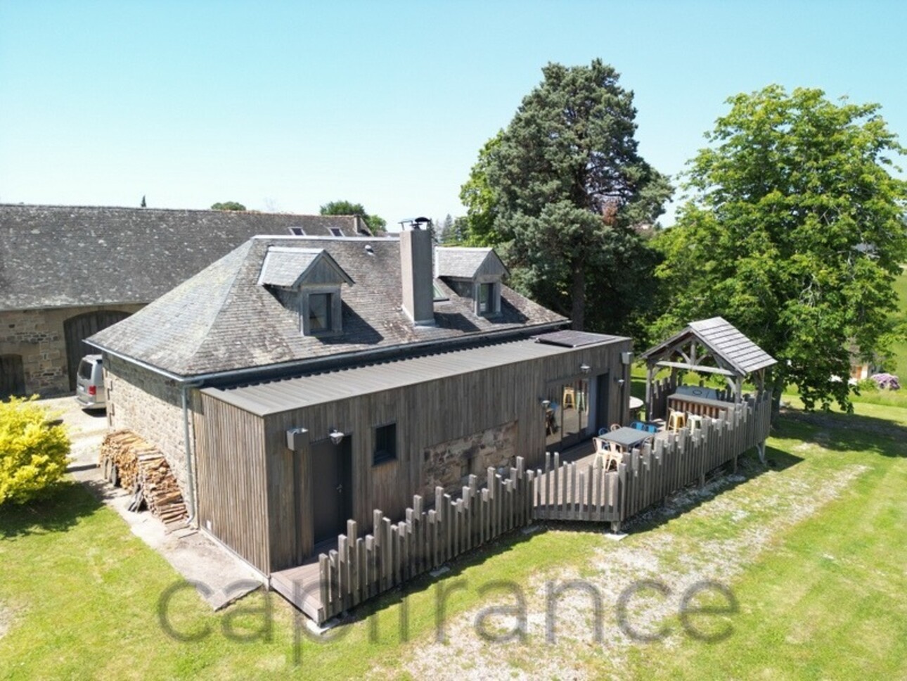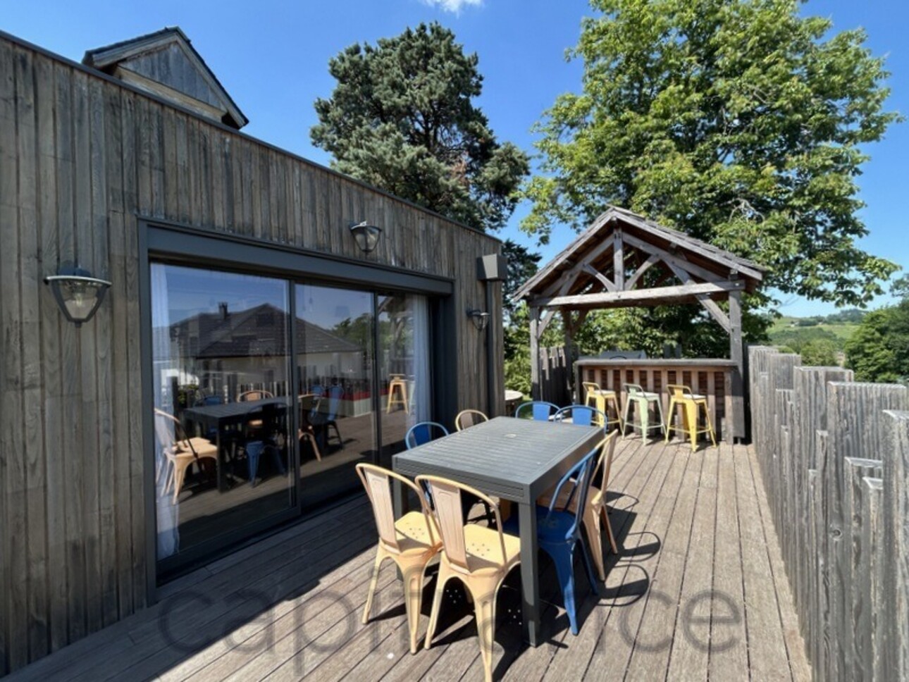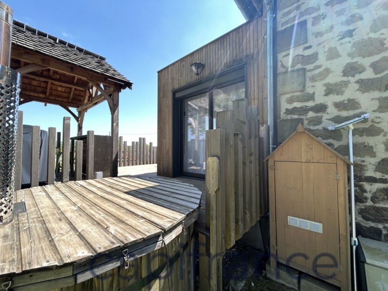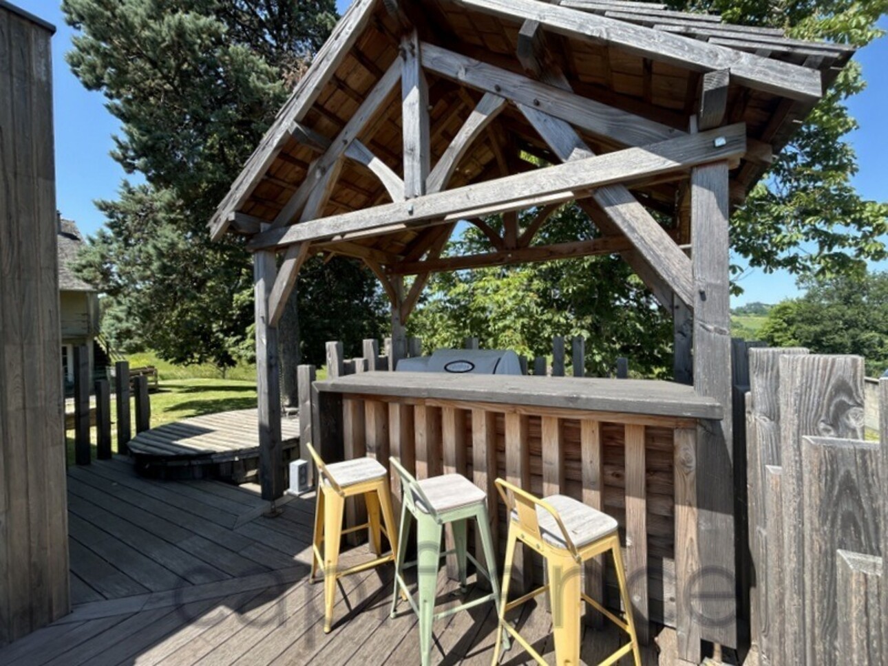 Terrasse bois avec bar et hot tub, vue dégagée sur parc arboré et campagne