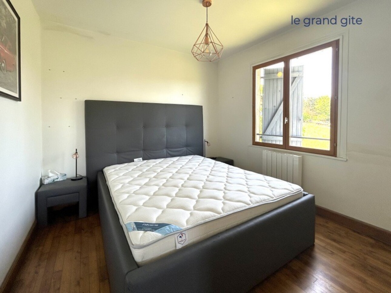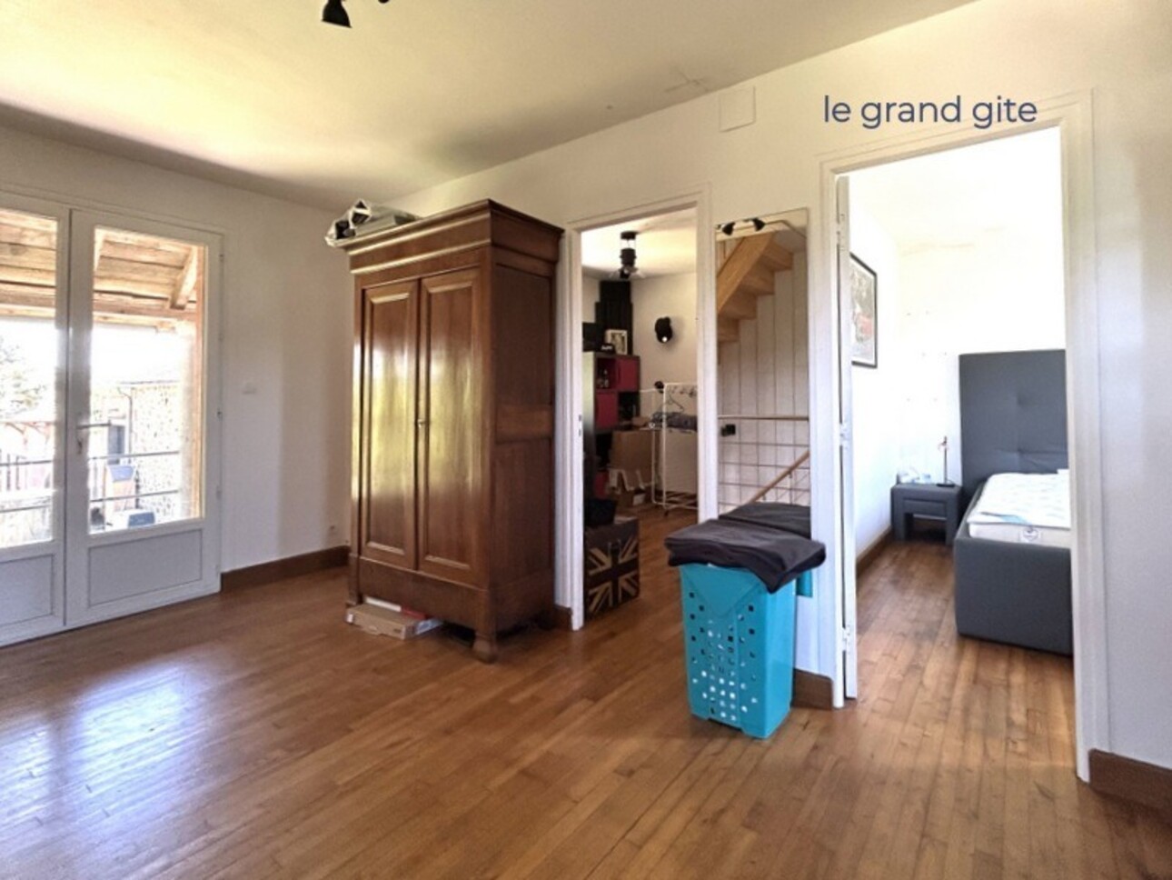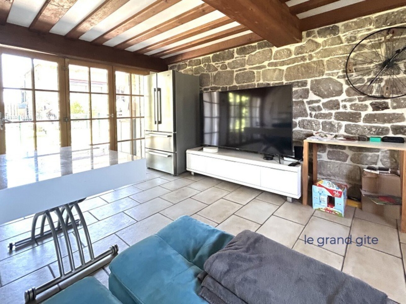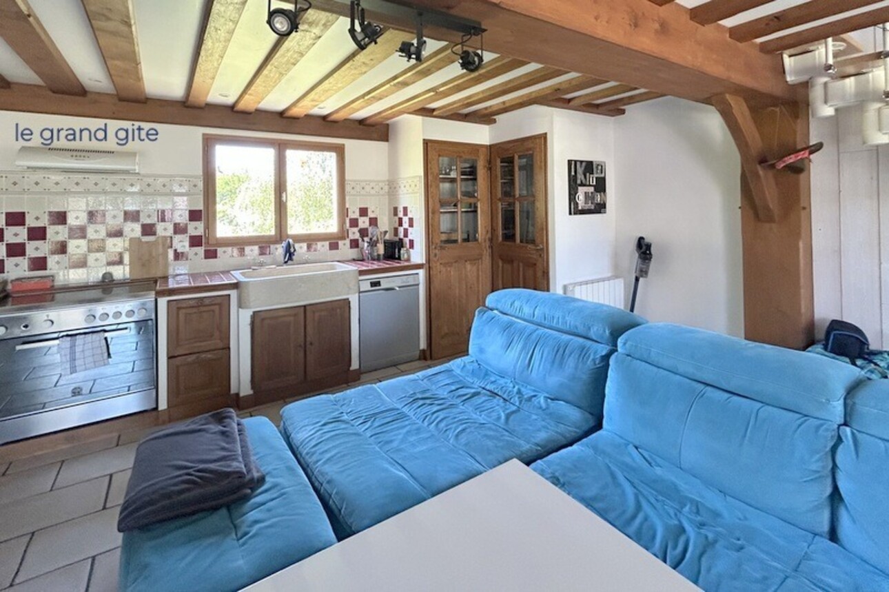 Jolie pièce de vie avec ses poutres apparentes, double portes vitrées, cuisine ouverte, 3 chambres, salle d'eau avec WC Terrasse et balcon. Vue sur la campagne.
