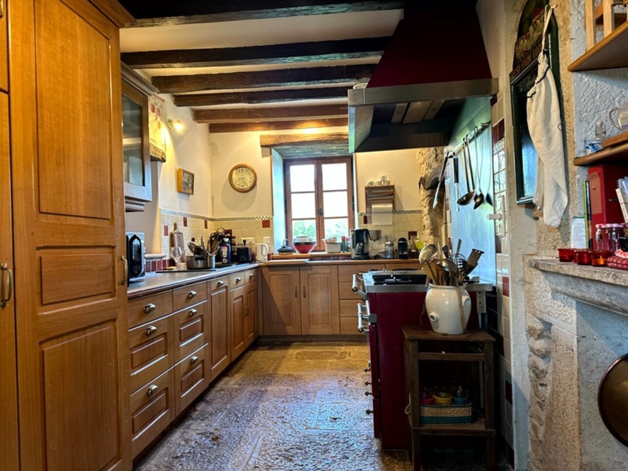 • Cuisine indépendante d'environ 16,5 m², entièrement aménagée et équipée (cuisinière et hotte Lacanche, deux fours : gaz et électrique)