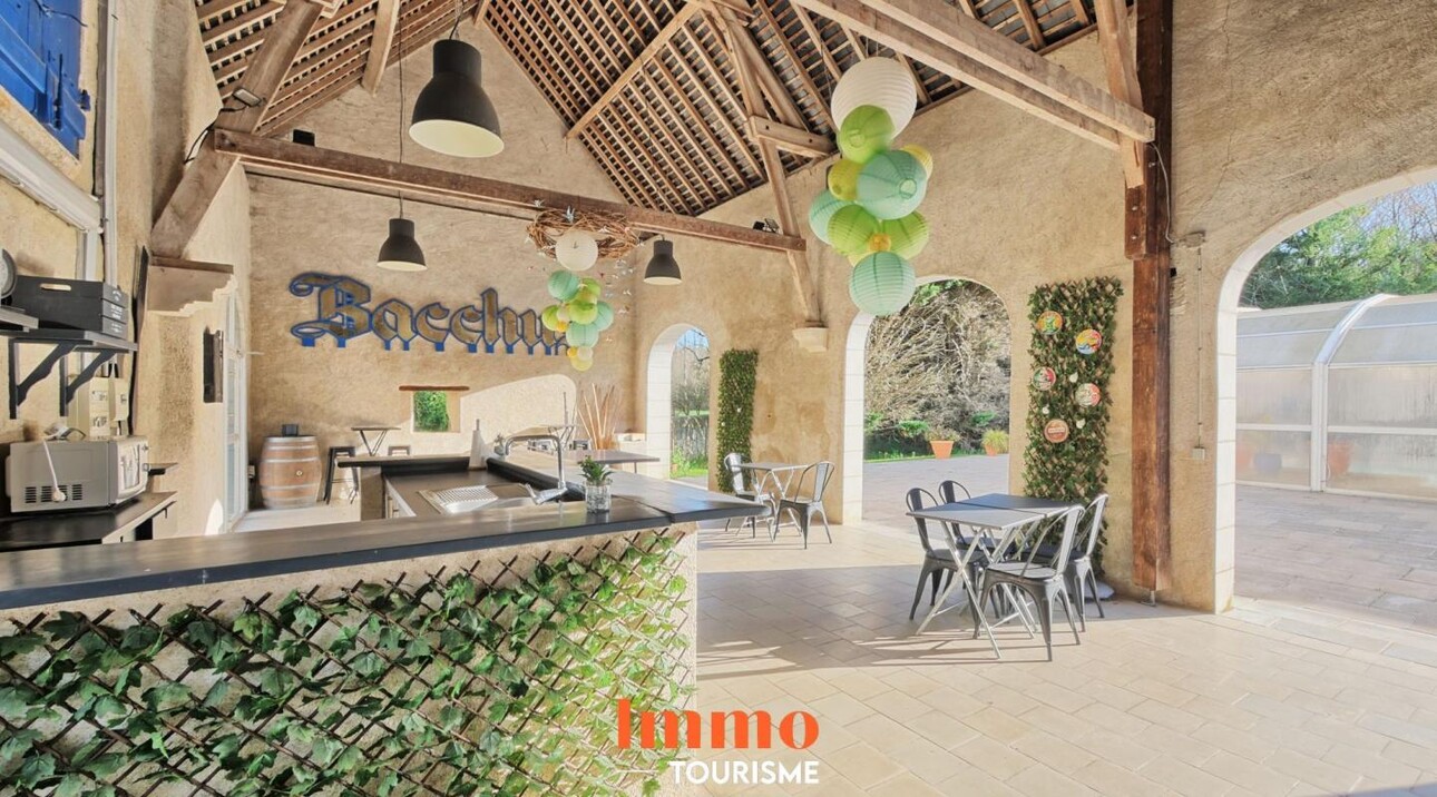 Un bâtiment annexe propose un vaste ESPACE DE RECEPTION semi-ouvert avec espace bar et sanitaires. Cette espace ouvre sur la zone piscine couverte complètement abrité et peut être agrandi par 2 garages attenant pour une surface totale de plus de 150m².
