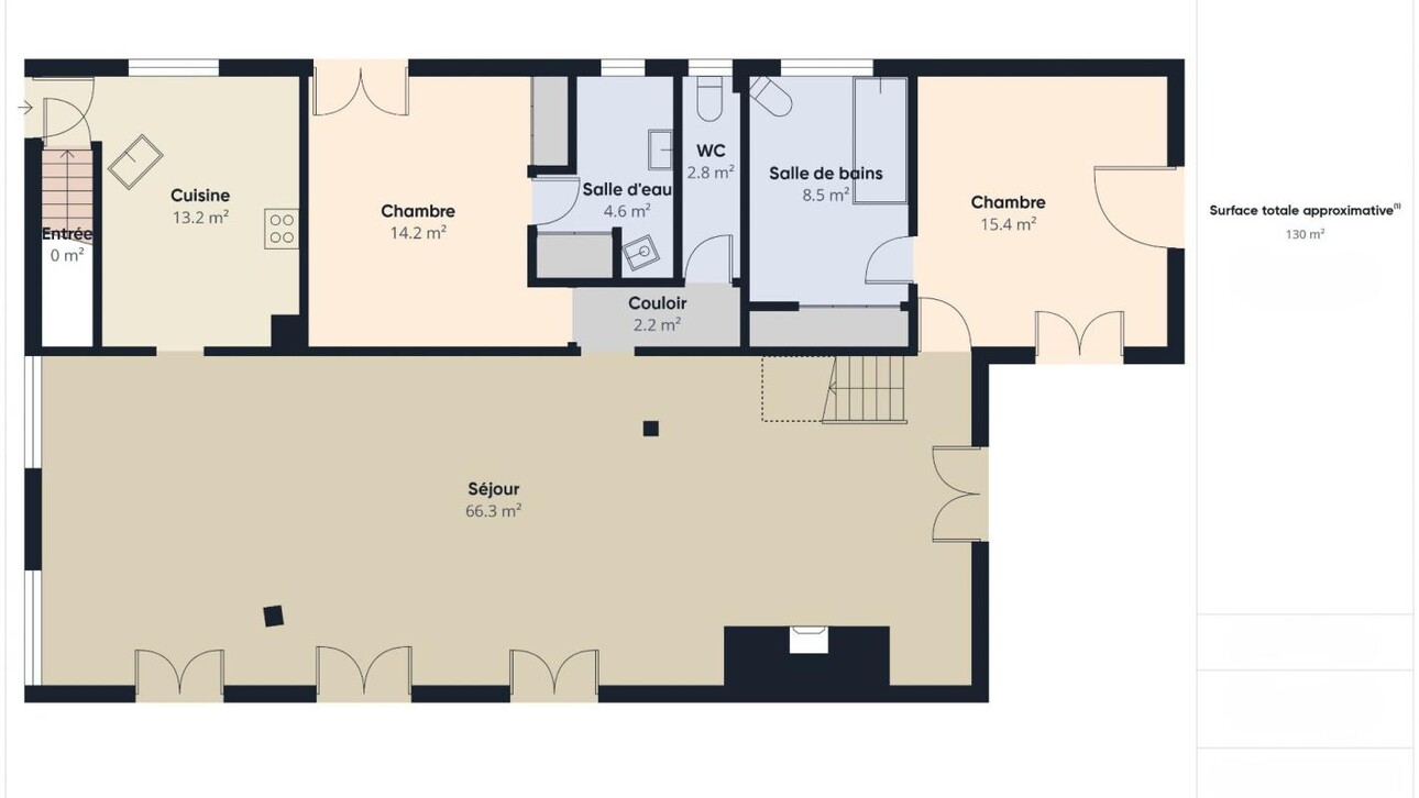 Dès l'entrée, le séjour de 65 m² révèle de beaux volumes : belle hauteur, lumière traversante, circulation fluide et cheminée centrale en pierre donnent immédiatement sa personnalité au lieu.