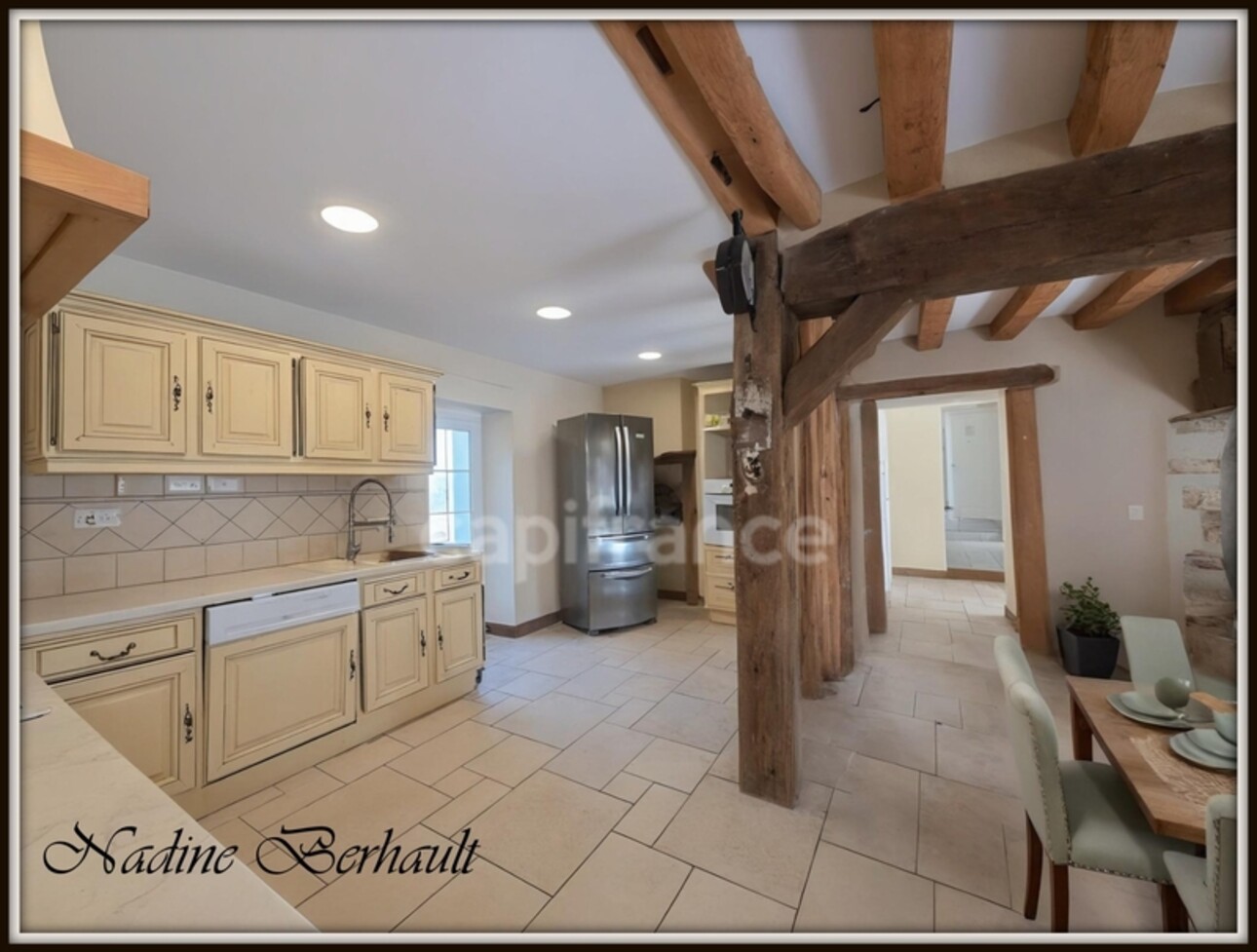 Salon avec cheminée, cuisine aménagée. Chauffage au sol, pompe à chaleur.