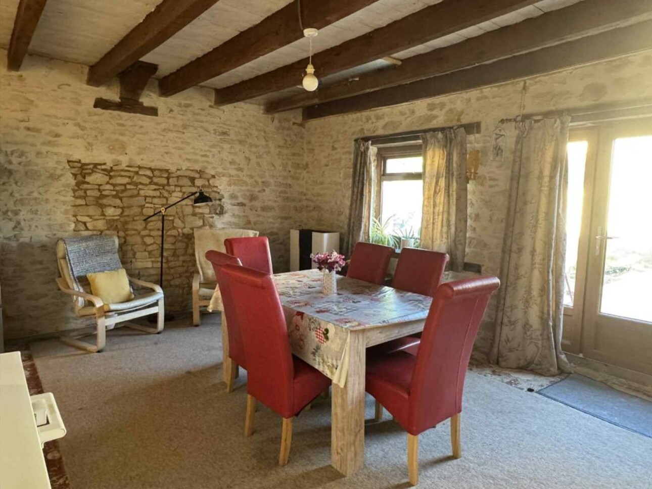 Jolie ferme française, beaucoup de caractère, mais tout le confort de la maison.Située au centre d'un petit village mais à seulement 12 km des commerces, bars, restaurants, etc., cette maison dispose d'un joli jardin avec des arbres fruitiers et une vue sur la campagne environnante. Elle dispose également d'un garage séparé pour deux voitures, nouvellement construit, ou d'une cave pour hommes. Cette maison a bénéficié de nombreuses améliorations récentes, notamment un nouveau poêle à bois, un nouveau poêle à granulés et un nouveau patio. Les deux salles de bains et la buanderie ont été récemment rénovées.