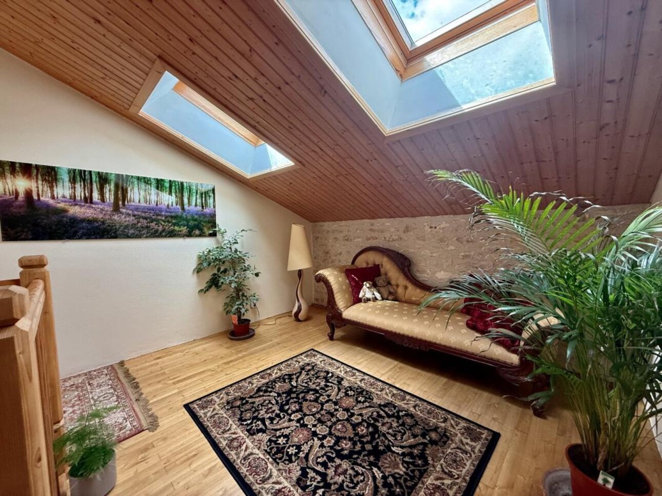 À l'étage, le palier avec galerie mène à deux chambres spacieuses avec salle de bains privative, l'une avec douche à l'italienne, l'autre avec baignoire et douche séparée. Un deuxième escalier partant de la cuisine mène à un autre palier desservant deux autres chambres.