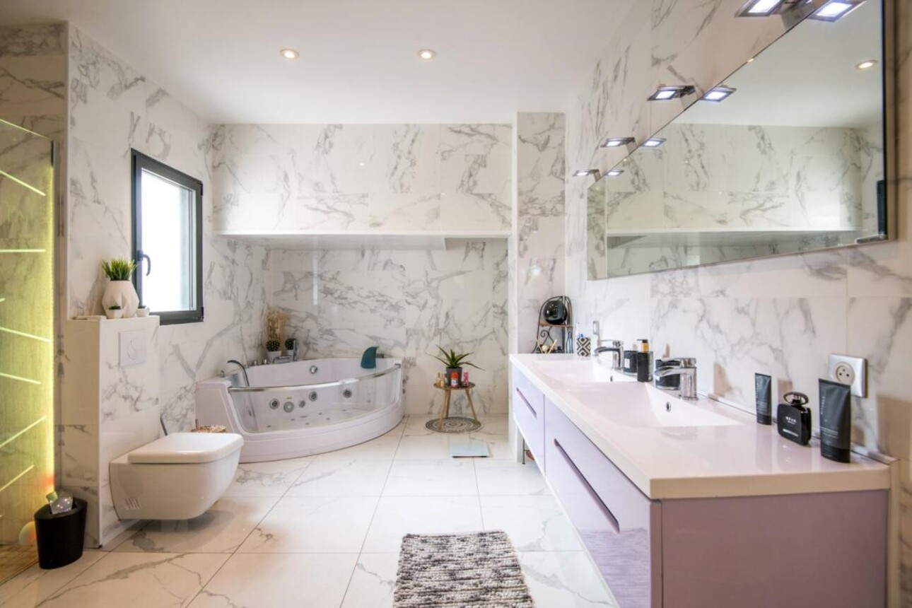 L'espace bien-être comprend une salle d'eau avec baignoire spa éclairée, un hammam, ainsi qu'un système de chauffage au sol par pompe à chaleur et climatisation réversible. Un insert à granulés encastré complète l'ensemble.