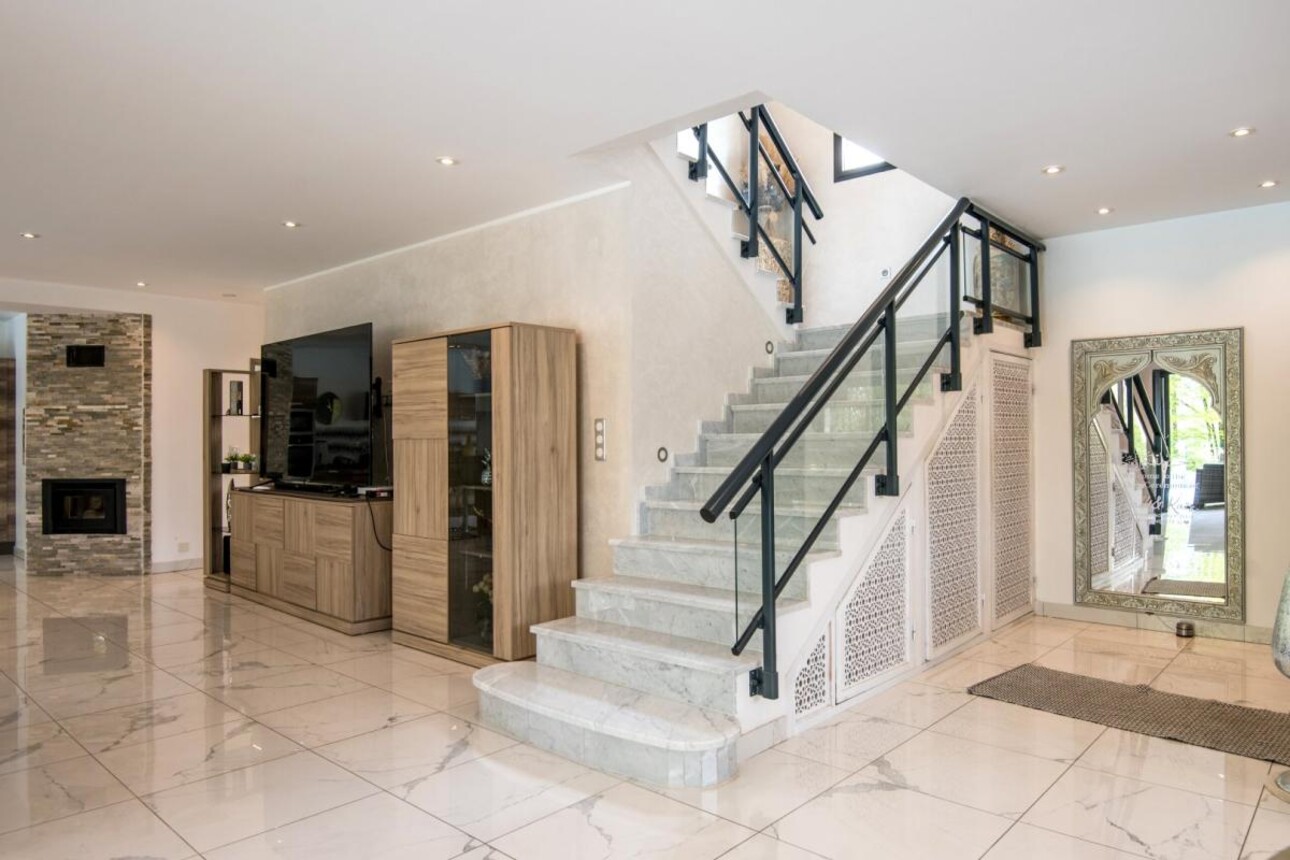 La pièce de réception d'environ 100 m² impressionne par une portée de 7 mètres sans poteau, créant un volume ouvert d'une rare élégance. Les larges baies vitrées à galandage assurent une continuité parfaite entre les espaces intérieurs et les terrasses extérieures.