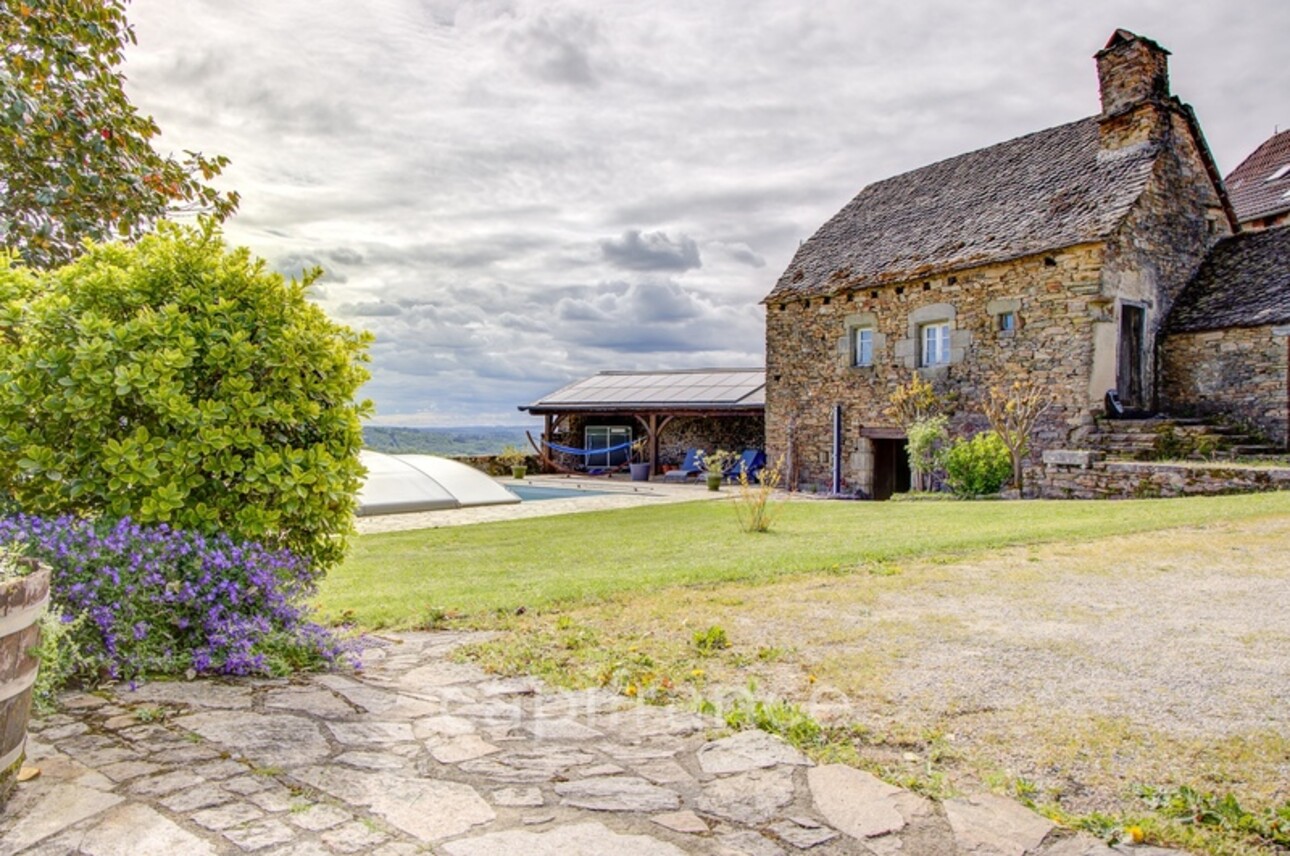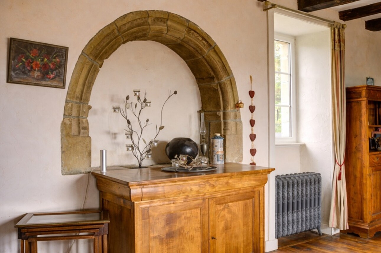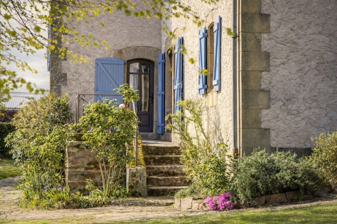 Les menuiseries récentes en aluminium anthracite s'intègrent harmonieusement à l'esthétique du bâti, tandis que des volets en bois de châtaignier massif renforcent le caractère authentique de la propriété.