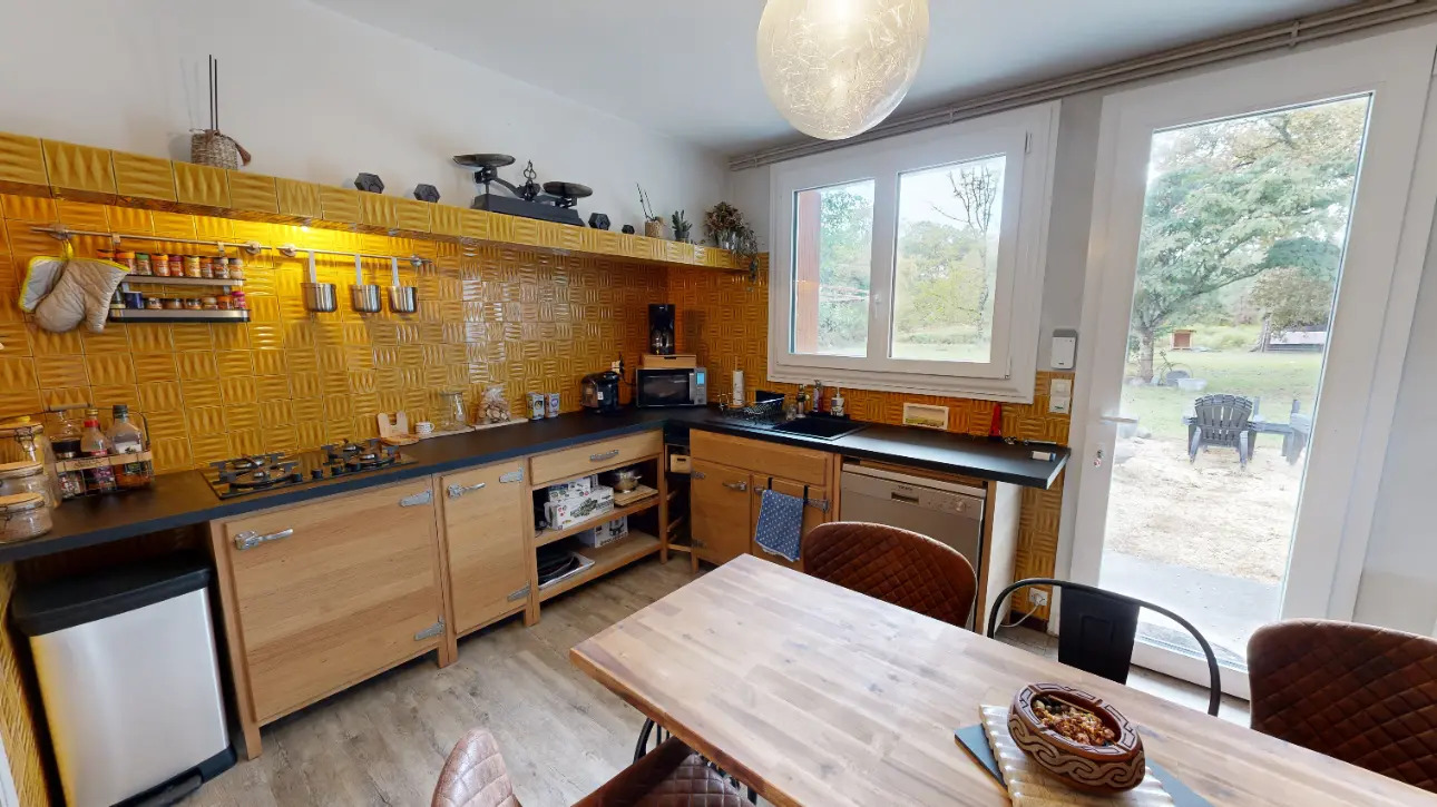La maison est composée d'une entrée, d'un séjour lumineux dans lequel vous pourrez passer d'agréables moments auprès de la belle cheminée, une vaste cuisine indépendante aménagée dans un style authentique et donnant sur l'extérieur, 3 chambres dont 2 disposent de porte fenêtre également, une jolie salle de bain et un WC séparé.