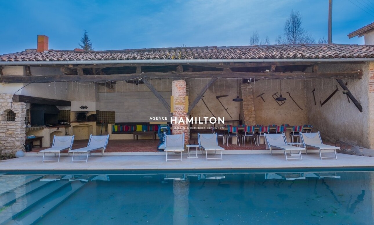 Passé le portail, la première cour permet le stationnement de plusieurs véhicules. La seconde cour, abritée des regards et aménagée autour de sa piscine chauffée de 11 x 5 mètres, comprend un pool house avec son four à pizzas et un magnifique espace couvert permettant de prendre les repas à l'extérieur dès les beaux jours. Depuis cet espace, il est possible d'accéder à une agréable terrasse surélevée d'environ 47 m², avec vue sur le domaine et ses environs. Une salle de massage attenante agrémente le tout.