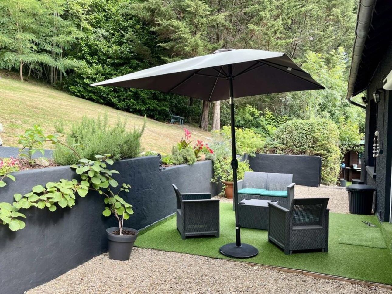 La spacieuse et lumineuse pièce principale avec insert s'ouvre sur la terrasse arrière et mène à deux chambres double et à une salle de bain avec douche à l'italienne et baignoire.