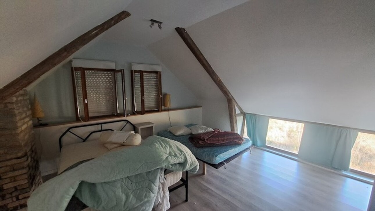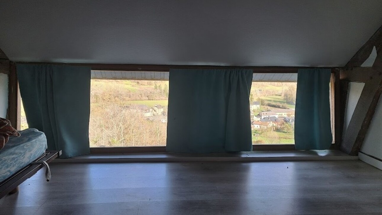 Environ 80m2 habitable, entrée-cuisine, salle à manger avec poêle, pierres et poutres apparentes donnant sur terrasse de 45m2 avec en contrebas le village. A l'étage 2 chambres mansardées dont une de 15m2 avec des "baies vitrées" niveau sol pour la luminosité et la vue sur la campagne, une salle d'eau et des espaces de rangements.