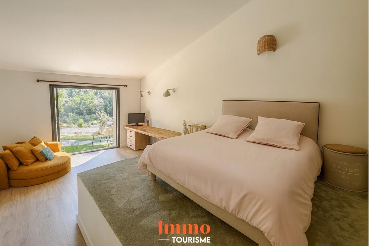 Entièrement rénovée entre 2023 et 2025, la maison offre un cadre de vie contemporain et chaleureux, parfaitement adapté à une activité de chambres d'hôtes haut de gamme ou à un usage mixte. La pièce de vie d'environ 75 m², ouverte sur le paysage, regroupe cuisine sur mesure, salle à manger et salon. La maison comporte quatre chambres, dont deux suites de plain-pied idéales pour l'accueil. À l'étage, deux chambres lumineuses se partagent une salle d'eau moderne.