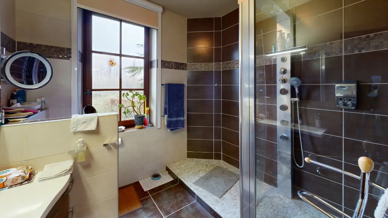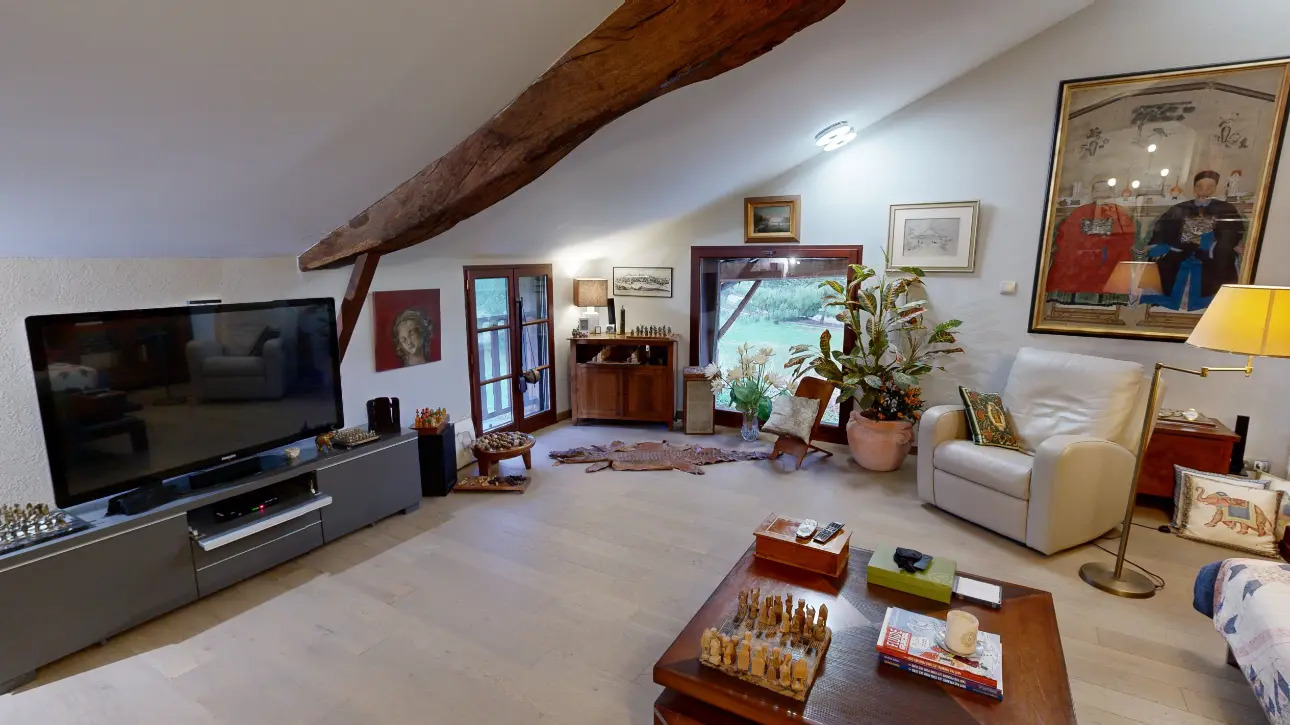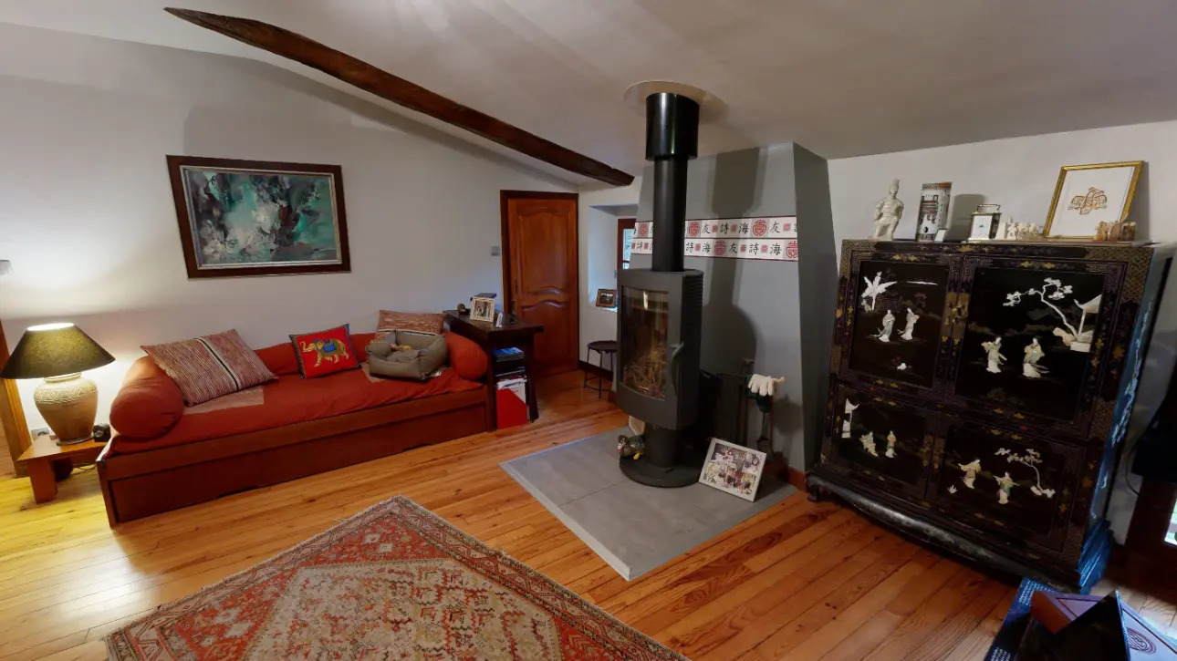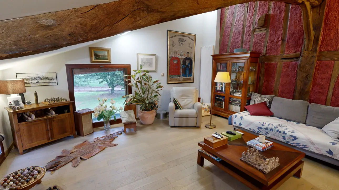 Une grande salle de bain avec sa baignoire biplace, un confortable bureau avec un poêle à bois, un charmant salon mansardé avec une belle hauteur sous plafond et de grands vitrages apportant une belle luminosité complètent ce niveau.