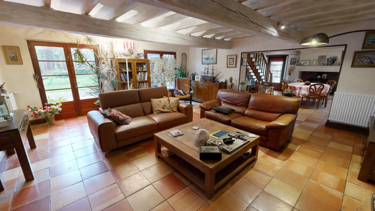 Au RdC, un spacieux hall d'entrée vous conduira vers un vaste salon avec sa cheminée Polyflam, offrant une belle luminosité, en enfilade une salle à manger avec son poêle à bois.