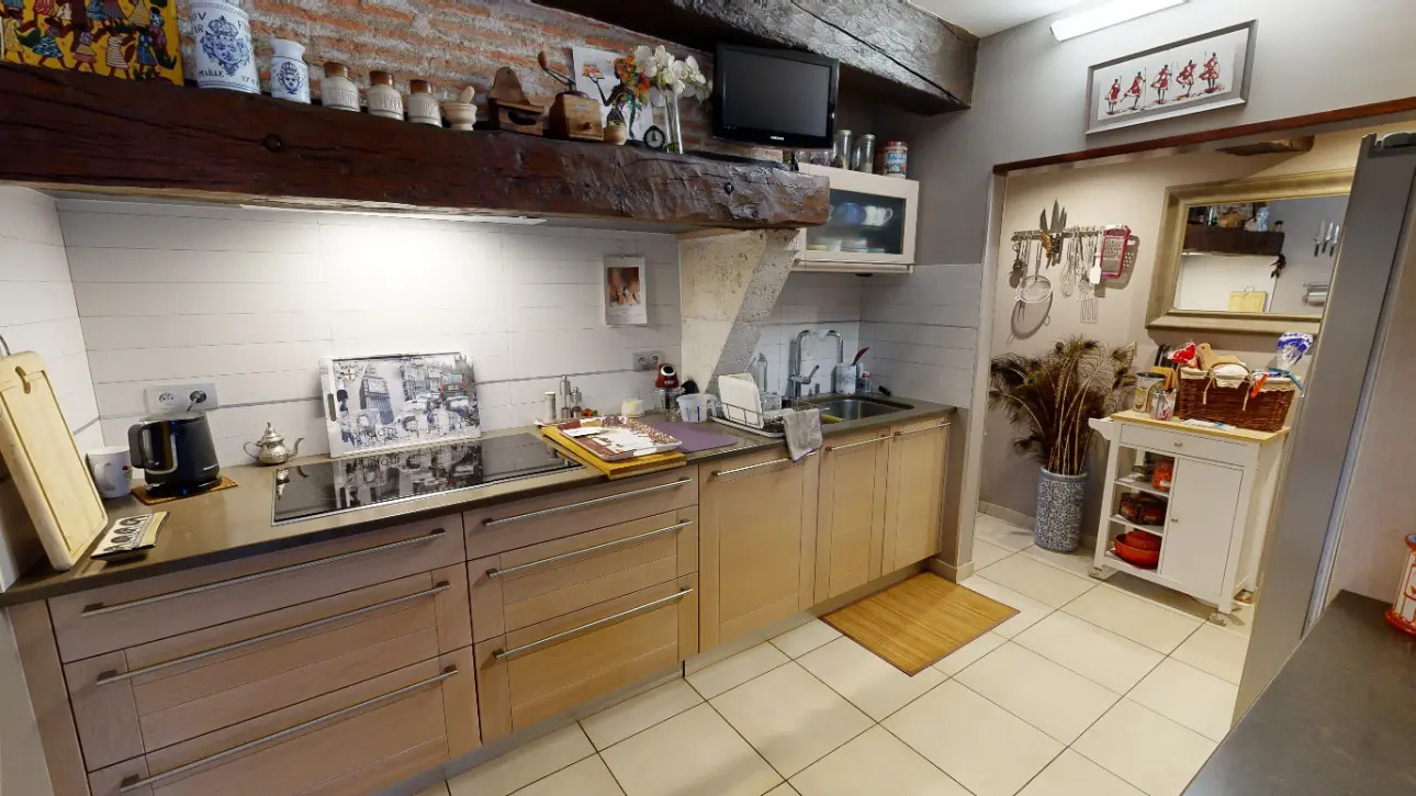 La cuisine moderne et équipée suivie d'une arrière-cuisine, vous donne un accès direct sur la splendide terrasse couverte ornée de poutres anciennes et commune au salon.