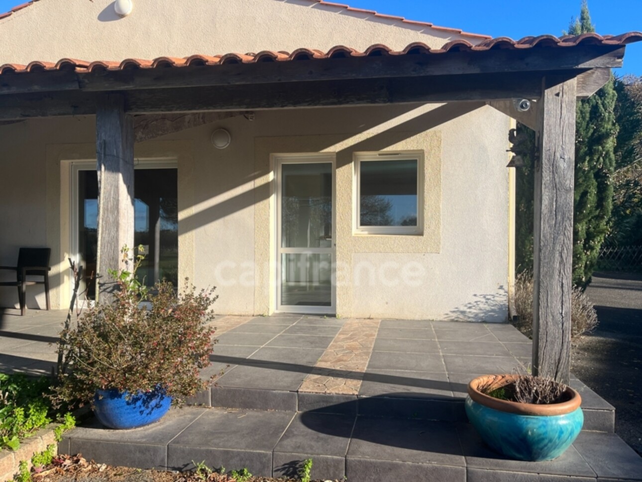 Entrée sud : logement indépendant comprenant une pièce de vie avec cuisine ouverte, deux chambres, une salle d'eau et un WC. Une terrasse attenante invite à profiter pleinement des extérieurs.