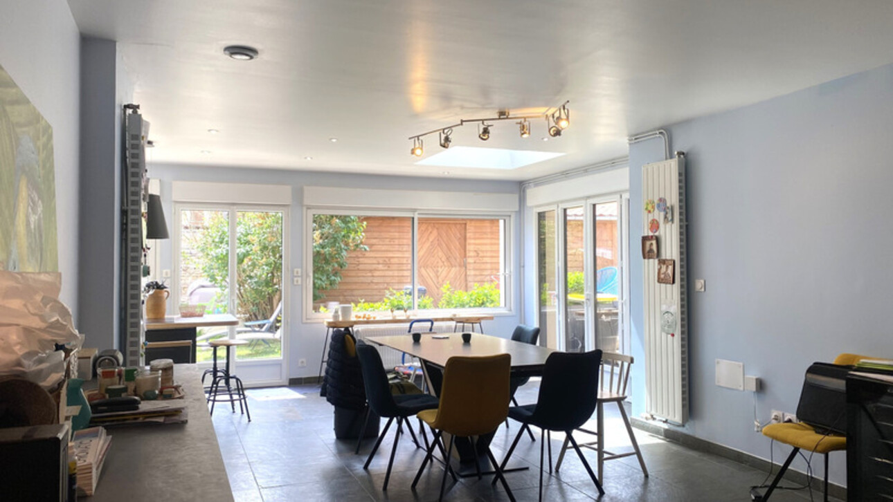 Au rez-de-chaussée, vous serez séduit par une cuisine ouverte sur salle à manger baignée de lumière naturelle, parfaite pour les moments conviviaux, et un salon lumineux avec sa cheminée insert. Une buanderie, chaufferie et WC.