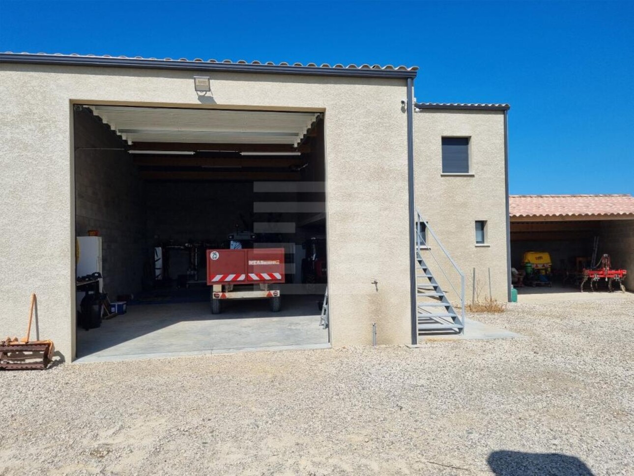 Hangar de 138m² construit en 2023 en parpaing de 27 avec charpente bois et panneaux sandwich. Dalle béton lisse. Grande porte automatique Hauteur sous faitière importante Pièce bureau isolée, sanitaires complets en bas, établis en place. Auvent ouvert de 25m² attenant en dur aussi pour rangement matériel au sec A l'étage petit appartement moderne et neuf de 45m² avec cuisine équipée, 2 chambres de 8-9m², SDB et séjour.(branchement électrique séparé, pré-équipement climatisation, eau de ville). L'ensemble est clôturé par un mur de parpaing avec cour stabilisée sur une parcelle de 1495m² Idéal pour artisan Propriété viticole de 16.5ha en AOP Corbières avec matériel complet de conduite des vignes. Le vignoble est en pleine capacité de production, excellement entretenu. Le matériel est en parfait état d'entretien (inventaire complet sur demande). ll a été expertisé à 80 000 €. Le propriétaire est prêt à accompagner le nouvel acquéreur pendant une durée à définir.